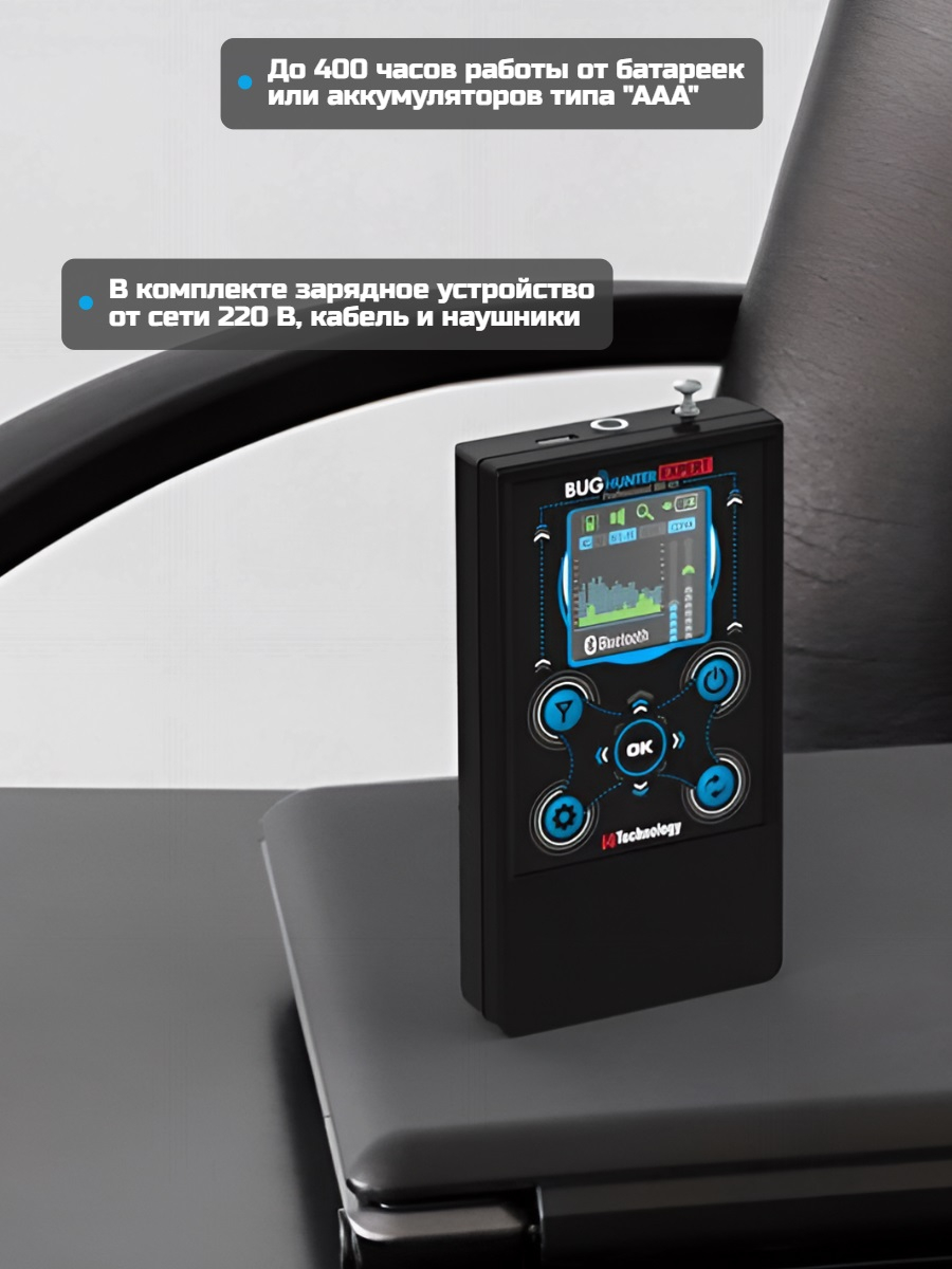 Ищете доступную и простую аппаратуру для профессионального поиска шпионских устройств? Хороший вариант — новейшая модификация Expert популярного индикатора поля "BugHunter Professional BH-03"! Быстро ищет все известные шпионские устройства, предоставляет исчерпывающую информацию о принимаемых сигналах и позволяет тонко настраивать работу под конкретную ситуацию. Обладает очень высокой чувствительностью, так как рассчитан на профессионалов в области борьбы со шпионажем, но настолько прост в работе, что подойдет всем желающим. Управление интуитивно понятно, поиск можно начать буквально по одному касанию!
