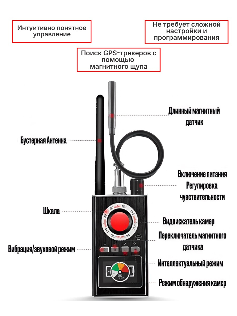 Магнитные GPS-трекеры можно обнаружить с помощью специального щупа. Для их поиска нужно активировать режим эндоскопа (вторая кнопка на панели управления). При этом загорится световой индикатор на щупе. Щуп можно выгнуть в удобную сторону, чтобы можно было поднести его под бампер автомобиля или в другое место, где может быть закреплен магнитный GPS-трекер. При обнаружении "шпионского" устройства антижучок оповестит об этом звуковым сигналом.