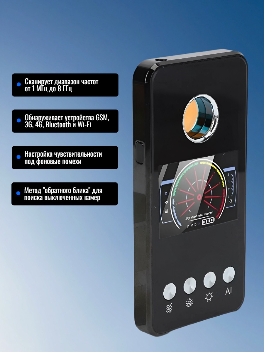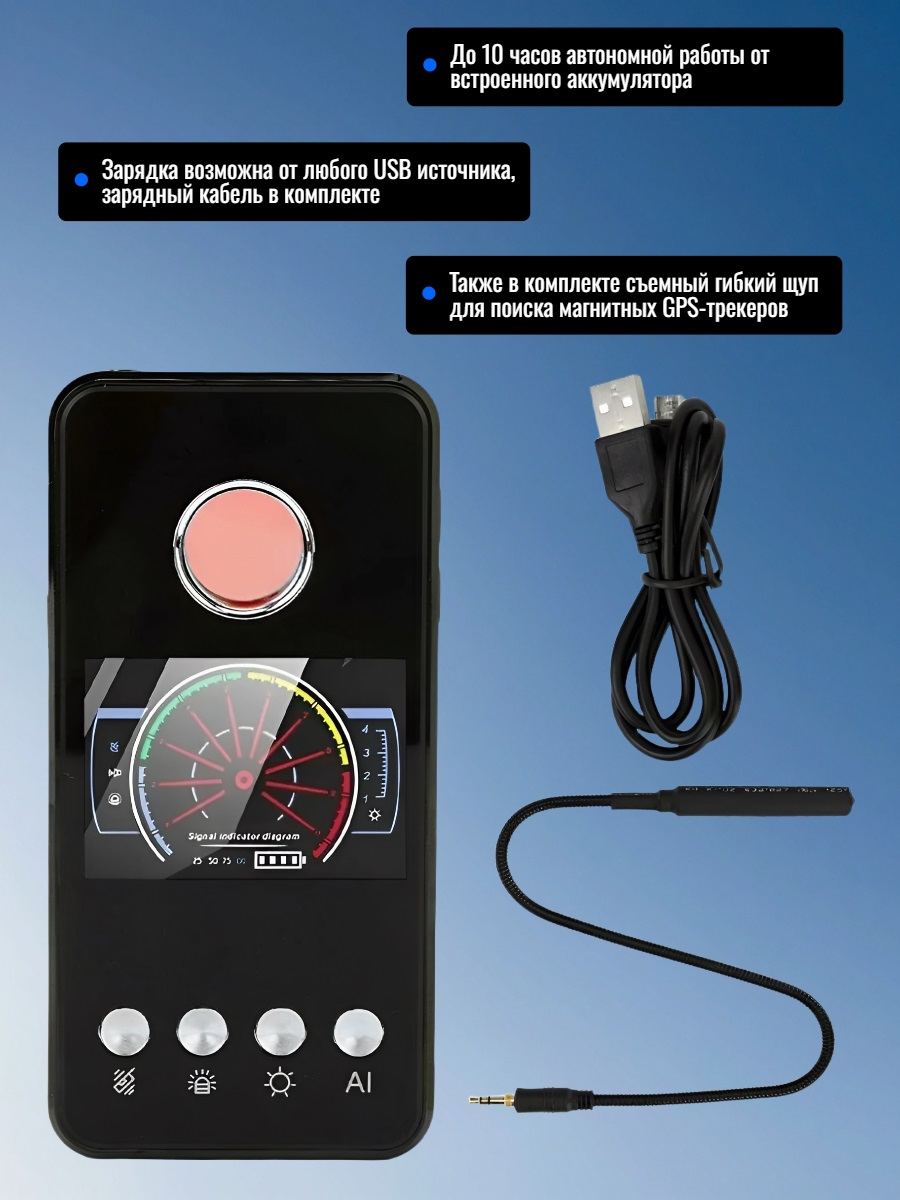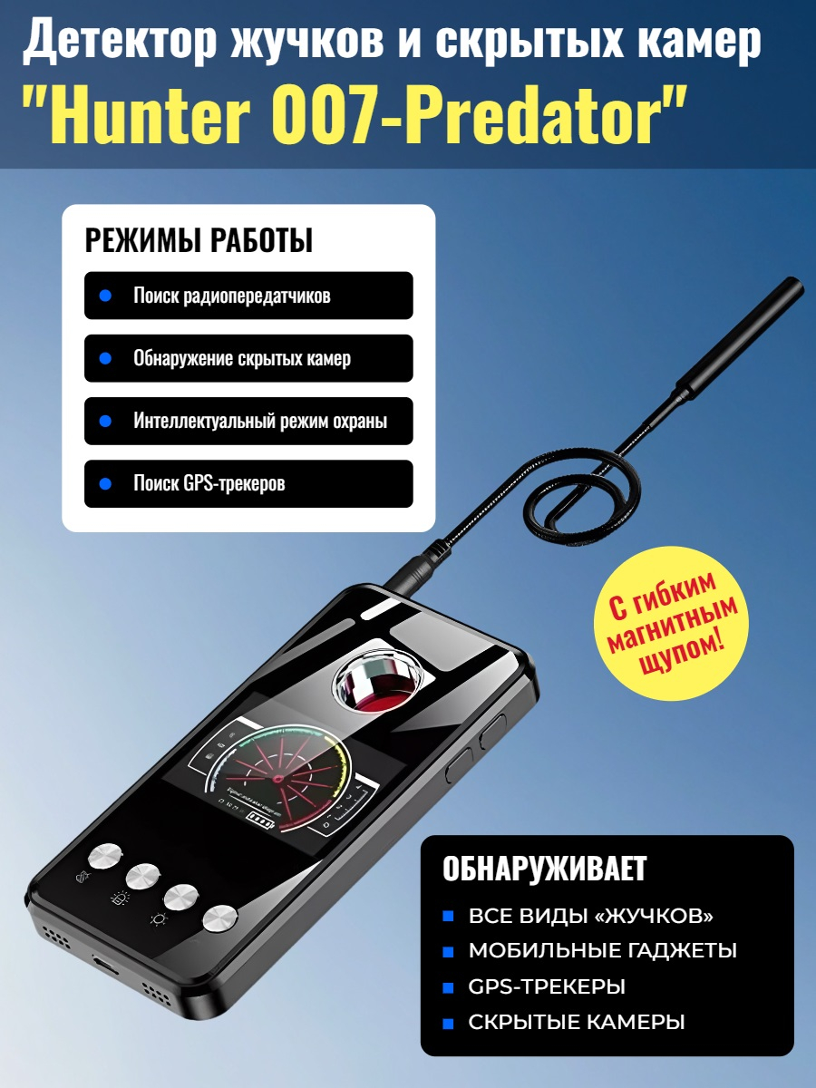 В современном мире информация распространяется с огромной скоростью, а ее объемы увеличиваются в геометрической прогрессии. Среди нее существует особый тип информации, который представляет наибольшую ценность: инсайдерская информация, важные данные о внутренних делах крупных компаний, бизнеса и т.д. Недобросовестные конкуренты часто используют прослушивающее оборудование, камеры, микрофоны и другие "шпионские" устройства, чтобы завладеть такой информацией. Защитить себя и свой бизнес от прослушки поможет модель антижучка "Hunter 007-Predator"! Это карманное устройство имеет полный набор функций, который поможет вам найти скрытые жучки, камеры наблюдения, микрофоны, GPS-трекеры и другие устройства передачи данных. С помощью данного прибора можно обследовать помещения и транспортные средства, находить активные жучки и устройства, работающие в "спящем" режиме. У антижучка даже имеется съемный щуп, позволяющий отыскивать GPS-трекеры, прикрепленные к днищу автомобиля на магните!