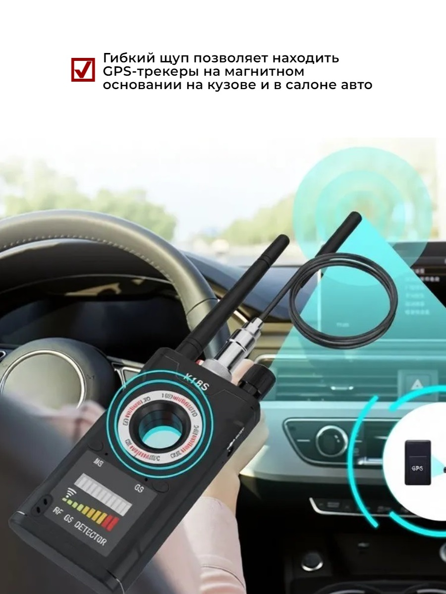 Обследование автомобиля на предмет наличия GPS-трекера осуществляется с помощью магнитного щупа, который идет в комплекте с прибором. Установите его на корпус антижучка и тщательно осмотрите днище машины, пространство за бампером и т.д. Щуп можно выгибать в любую сторону и под любым углом, что позволит вам быстро обследовать даже труднодоступные места. Поиск GPS-трекеров такой же, как и поиск жучков. В случае обнаружения такого устройства антижучок оповестит вас сигнализацией.