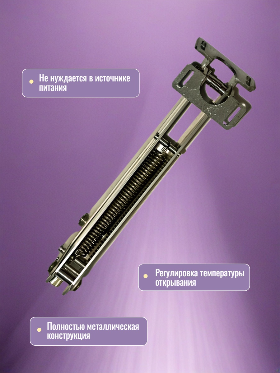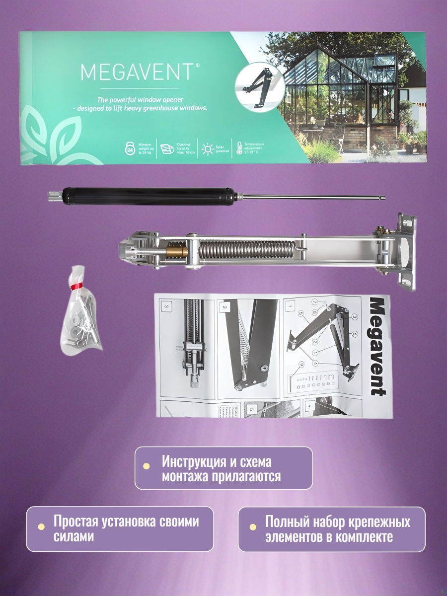 Усиленный автомат для проветривания теплицы "MEGAVENT" получил прочный корпус, мощные термопривод и пружину, что позволяет ему открывать тяжелые форточки (до 24 кг) даже при порывах ветра. Форточка автоматически открывается на разный угол при измерении температуры в теплице от 17 до 30 °C. Автомат полностью автономен, а для его установки не требуются специальные навыки.