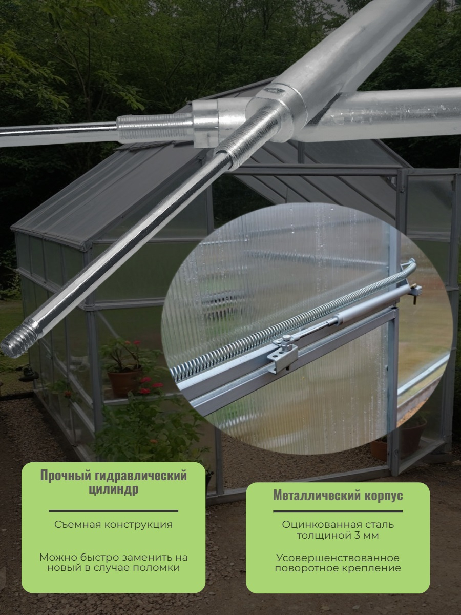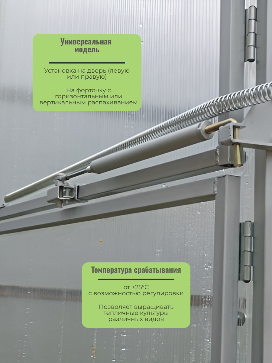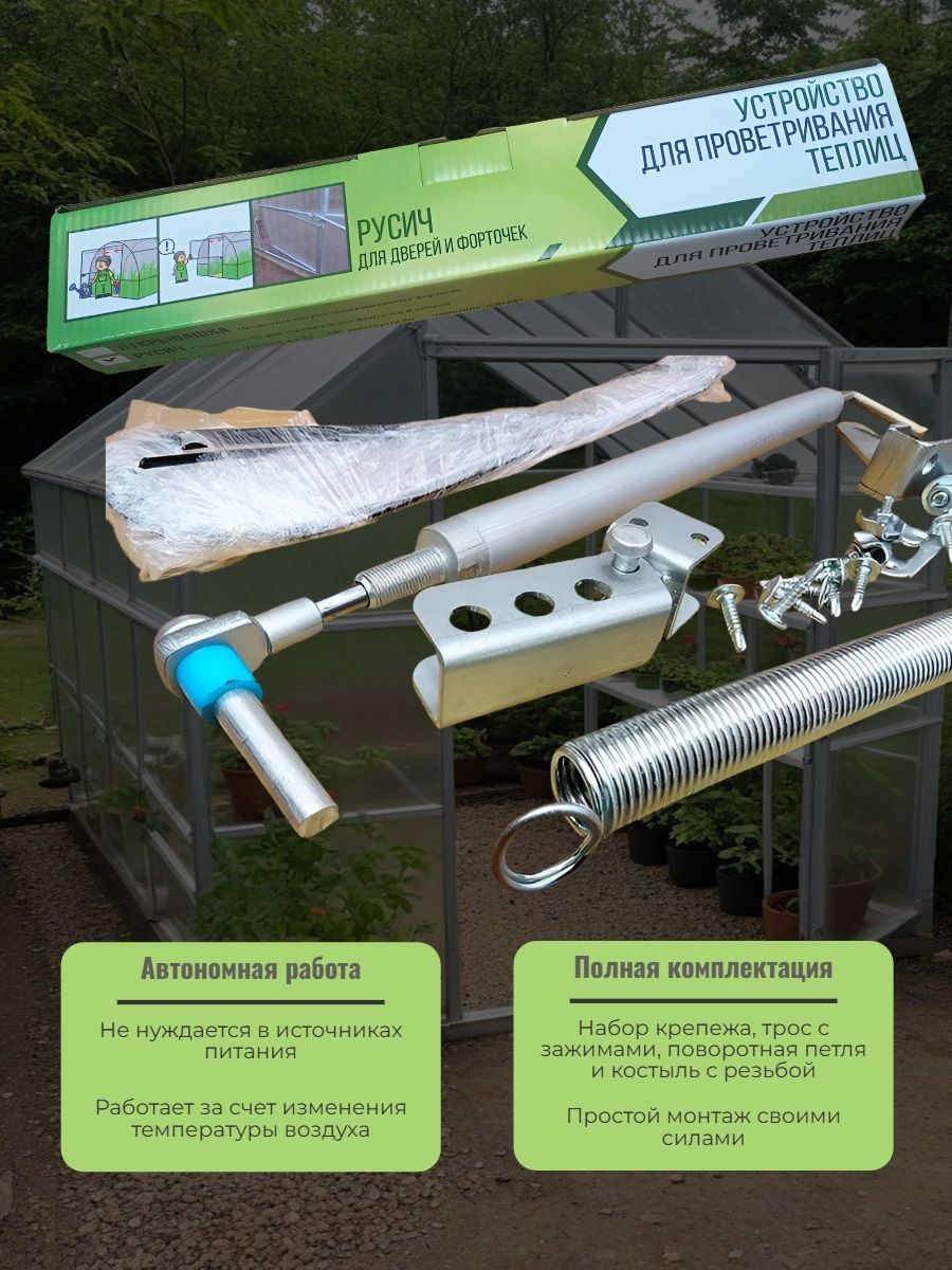 Автомат для проветривания теплицы "Русич" изготовлен из оцинкованной стали толщиной 3 мм и имеет усовершенствованное поворотное крепление, позволяющее широко открывать дверь без повреждения термопривода. Устройство получило механическую пружину для закрывания двери, что делает его одним из самых надежных на рынке. Модель универсальна и может без доработок устанавливаться на двери (левые и правые), а также на форточки. Осуществляет поддержание микроклимата в теплице, автоматически изменяя ширину открытия форточки при колебаниях температуры. Для работы устройству не нужны батарейки и электросеть, а произвести установку сможет любой пользователь. В комплект включена компенсационная петля, которая не мешает открывать дверь, чтобы войти в теплицу.
