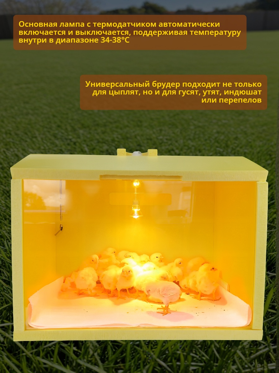 По внешнему виду брудер похож на коробку или контейнер, оснащенный двумя электрическими лампами: одна лампа с УФ свечением для обогрева камеры на 35 Вт и вторая для излучения ИК свечения на 15 Вт. Лампы создают имитацию солнечного света, который так важен для птенцов в первые дни жизни. Внутри камеры поддерживается постоянная оптимальная температура, а также создаются условия для здорового развития цыплят и их защиты от различных микробов. В результате обеспечивается максимально возможная выживаемость птенцов любой домашней птицы.