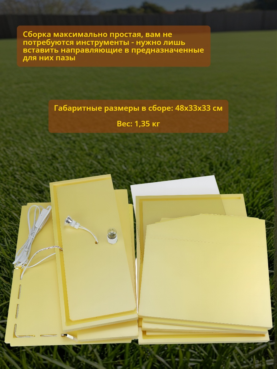 Легкий разборный корпус простой конструкции. Устройство выполнено из особого легкого материала, который называется экструдированный пенополистирол (ЭППС). Толщина стенок и дна брудера — 20 мм. По своим свойствам данный материал представляет собой утеплитель, который может долго удерживать постоянную температуру внутри камеры с цыплятами. Кроме того, ЭППС помогает рассеивать ИК свет от лампы по всему объему камеры. Корпус брудера устойчив к влаге, достаточно прочный и легкий и при этом экологичный и безопасный. Сборка изделия очень простая, вам не потребуются никакие инструменты — необходимо лишь вставить направляющие в предназначенные для них пазы.