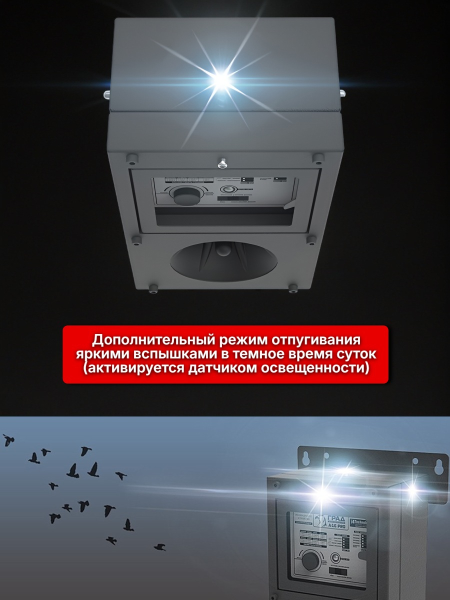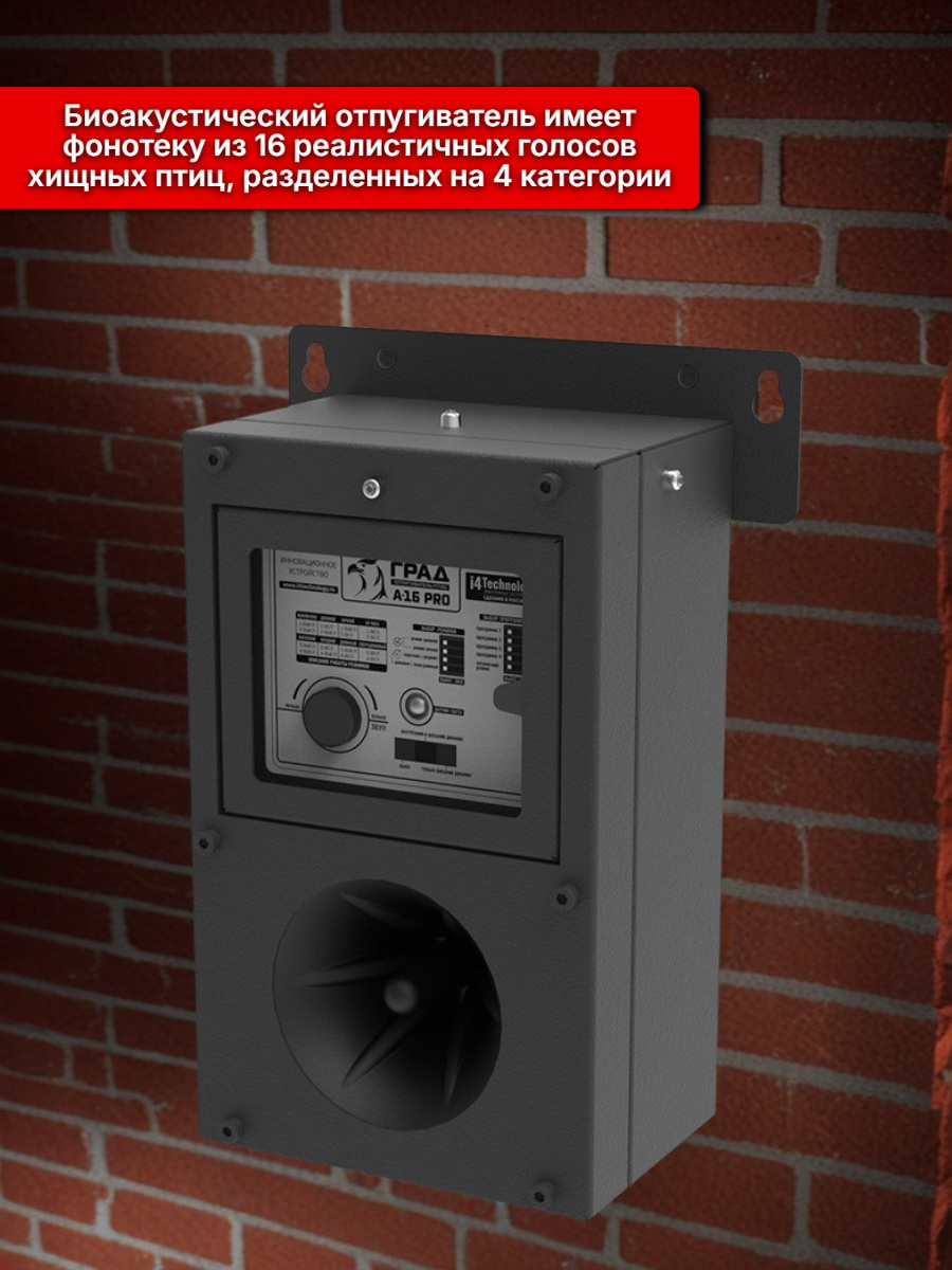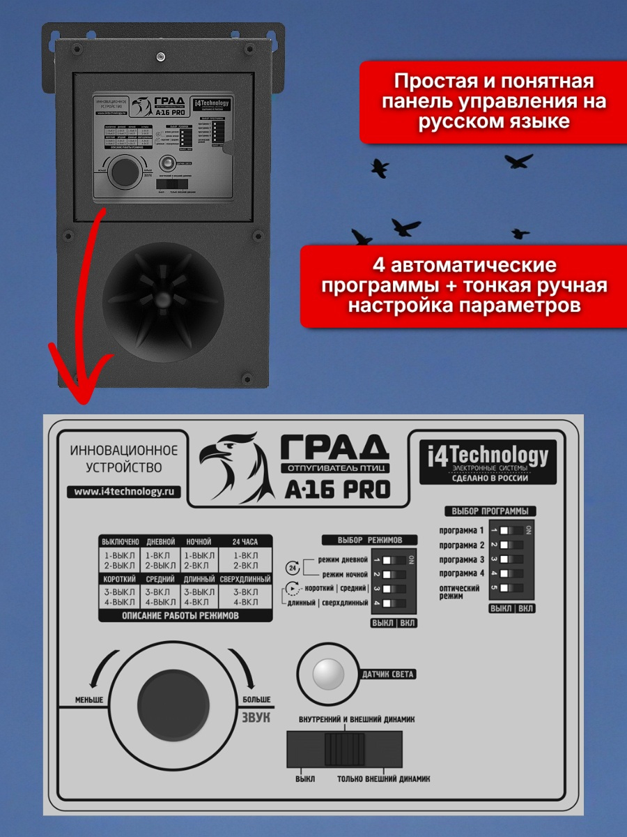 Биоакустический отпугиватель птиц "Град А-16" стал настоящим хитом продаж сразу же после выхода и остается таковым до сих пор. Однако разработавшие его российские инженеры из компании i4Technology, сертифицированным партнером которой является наш интернет-магазин, не остановились на достигнутом! Встречайте новый биоакустический отпугиватель птиц "Град А-16 Pro" — модель, которая была доработана и улучшена по желаниям реальных покупателей! Новый прибор отпугивает птиц еще эффективнее благодаря дополнительному световому воздействию, имеет больше разъемов для подключения внешних колонок и более простую панель управления, позволяющую даже новичку быстро настроить полностью автоматическую работу устройства.