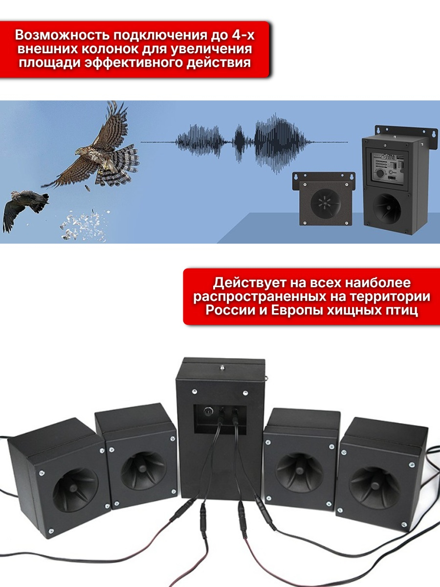 Фонотека данного устройства включает записи голосов наиболее распространенных в России и Европе хищных птиц. Прибор гарантированно отпугивает ворон, грачей, воробьев, гусей, лебедей, тетеревов, глухарей, журавлей, уток, чирок, фазанов, небольших чаек, дроздов, голубей, куропаток, летучих мышей. Вам нужно лишь выбрать одну из доступных автоматических программ работы: