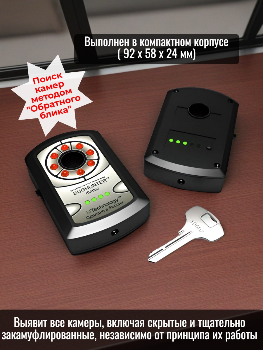 "BugHunter Dvideo" — уникальный российский прибор, обнаруживающий абсолютно все видеокамеры, в том числе скрытые, закамуфлированные, выключенные, проводные и беспроводные! 100%-ая защита от скрытых видеокамер и видеожучков!