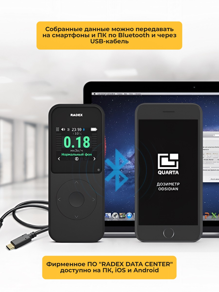 Если уровень радиации выходит за пределы возможного диапазона измерений данного прибора, то активируется тревожная сигнализация и вибрация устройства. Настройки дозиметра позволяют выводить данные в различных единицах измерения. На основе собранных данных вы можете составить наглядные схемы и графики при помощи ПО RADEX DATA CENTER для ПК или с помощью мобильных приложений для смартфона (под iOS или Android).