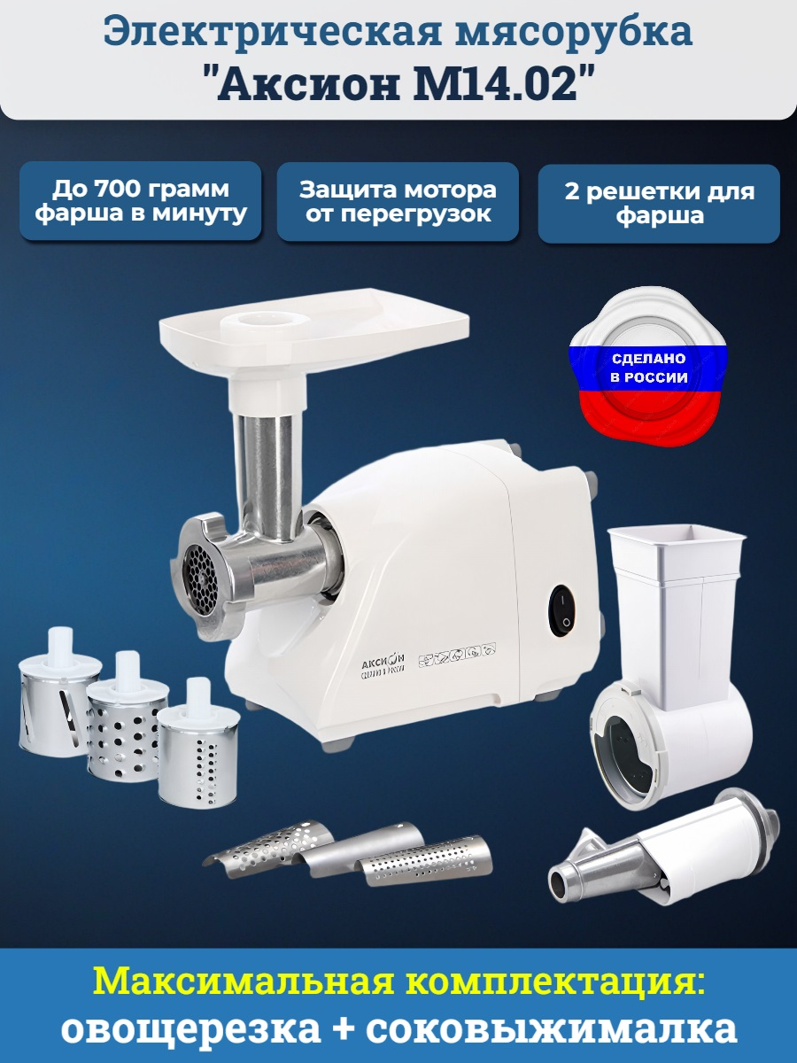Для небольшой семьи приобретать большую мощную электромясорубку не выгодно. Она будет затрачивать много электроэнергии, а использовать ее на полную мощность не придется, т.к. готовить фарш десятками килограммов нет необходимости. Для всех, кто подыскивает для себя или в подарок небольшую, но качественную мясорубку наш интернет-магазин рекомендует модель "Аксион М14.02". Устройство является разработкой отечественного завода и сочетает в себе все, что нужно для такого прибора: оптимальную мощность двигателя, качественное измельчение мяса, птицы, рыбы или других продуктов, простое управление и доступную стоимость. Мясорубка имеет компактный размер, ей будет удобно пользоваться даже на небольшой кухне, острый нож быстро перемалывает мясо, а стальные решетки позволяют получать фарш разной консистенции. Продуманная конструкция корпуса позволяет хранить мясорубку в горизонтальном или вертикальном положении, а ее сетевой шнур не будет вам мешать — для его хранения предусмотрен специальный отсек.