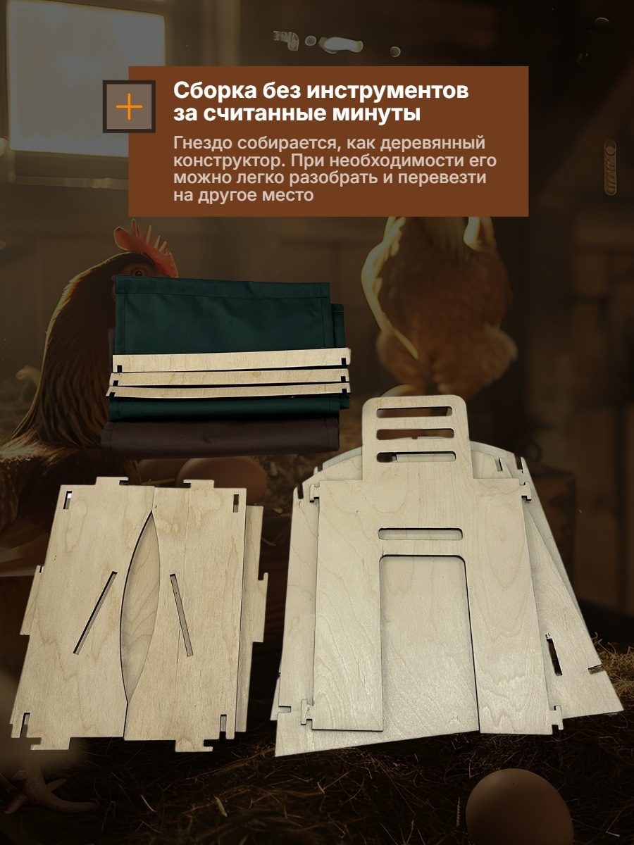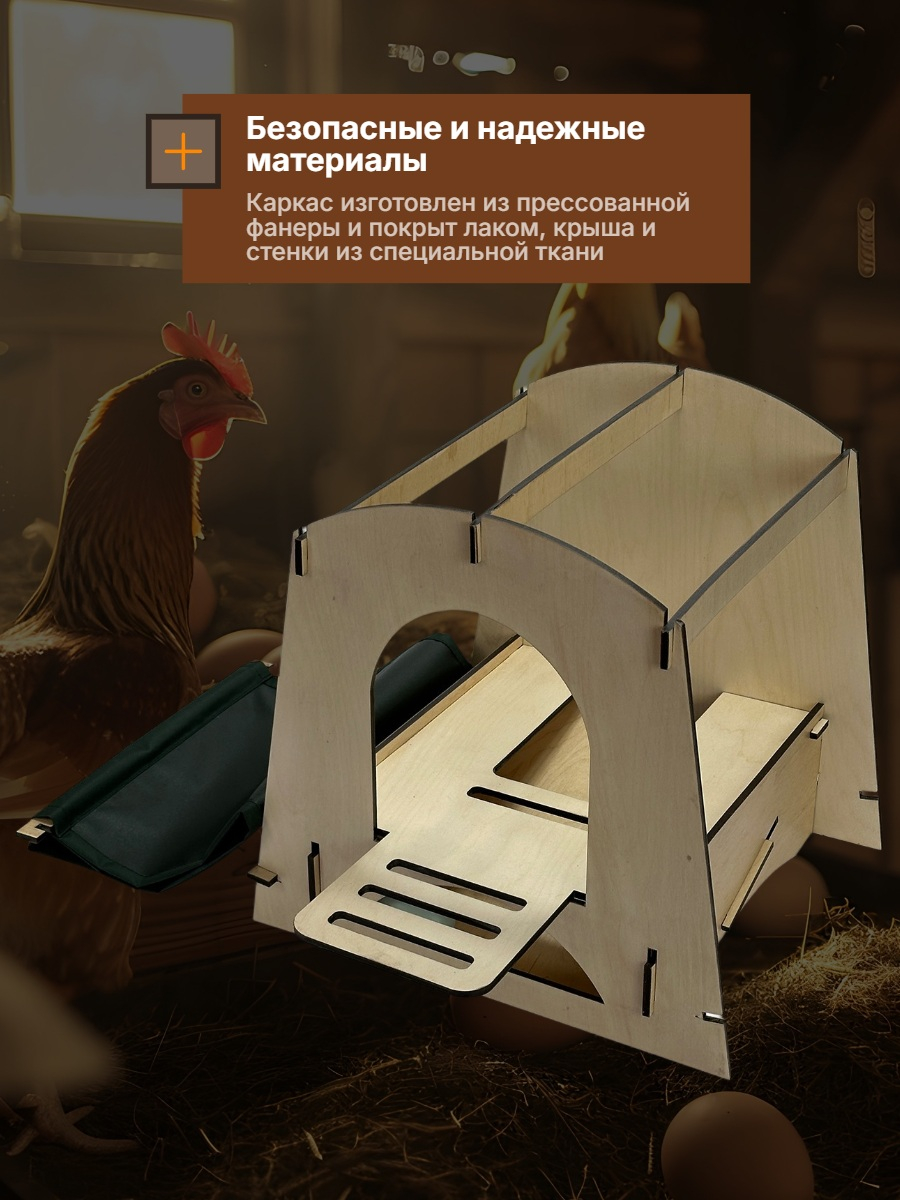 Данное изделие имеет 2 основные составные части: деревянную разборную основу и укрывную часть, изготовленную из ткани. После распаковки нужно собрать конструкцию и закрепить ткань на крыше и по бокам гнезда. Если сборка была выполнена правильно, вы получите небольшой домик, внутри которого расположен насест и яйцесборник, а снаружи — жердочка для запрыгивания курицы.