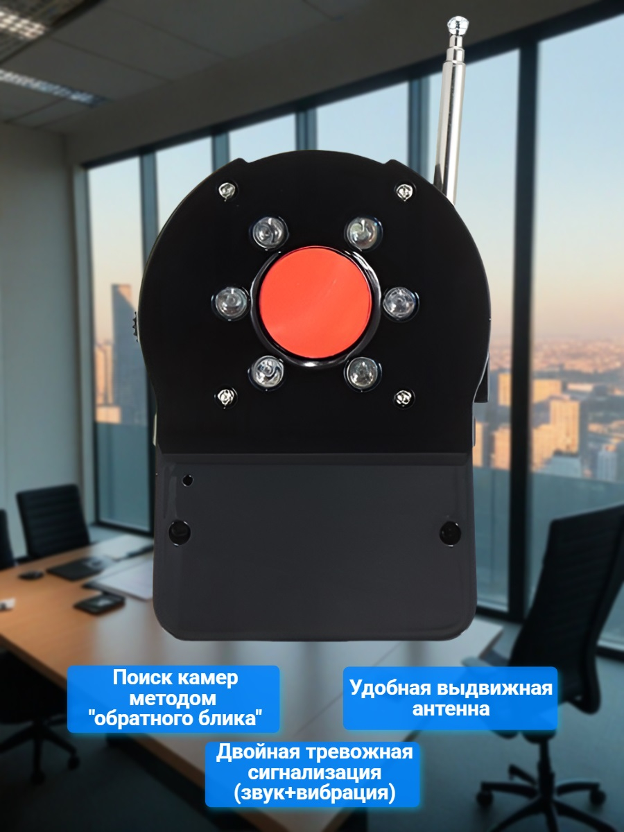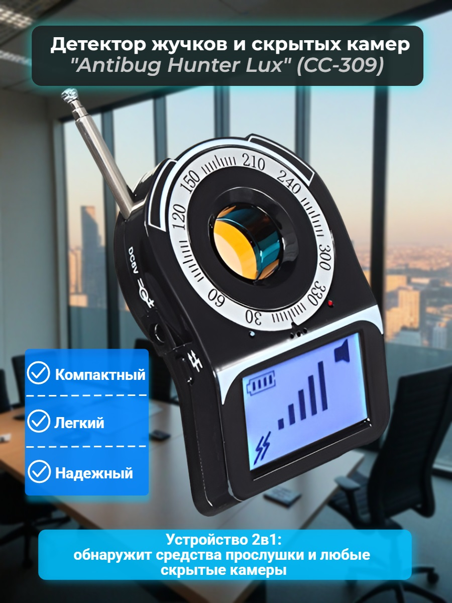Компактный детектор "Antibug Hunter Lux" (CC-309) предназначен для обнаружения не только жучков, но и скрытых камер, то есть позволяет пресечь не только несанкционированное прослушивание, но и фото/видеофиксацию различных мероприятий.