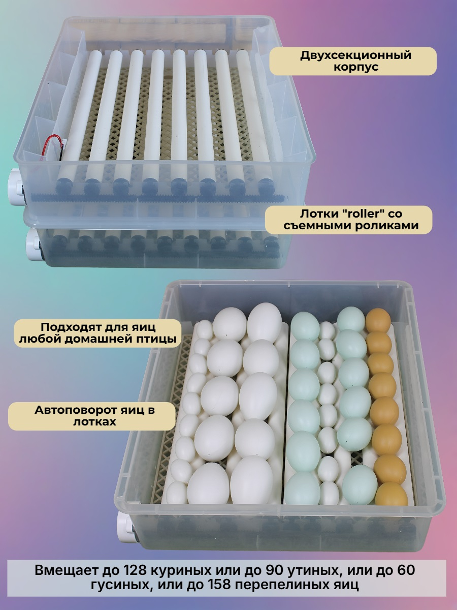 Вмещает до 120 куриных или до 90 утиных, или до 60 гусиных, или до 158 перепелиных яиц (в зависимости от размеров яиц)