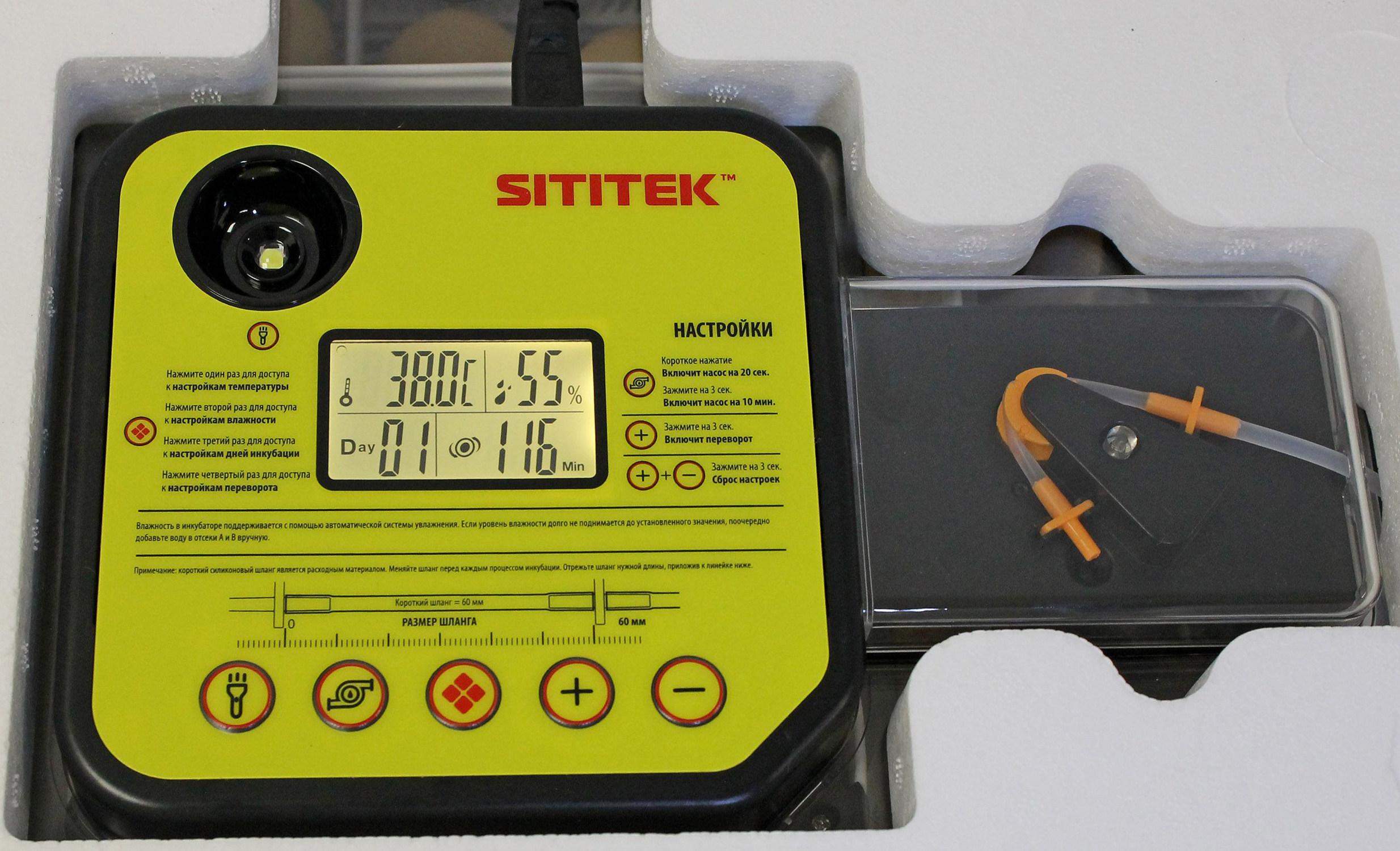 Панель управления располагается сверху на крышке устройства. Здесь имеется достаточно крупный ЖК дисплей, на котором отображаются текущие значения температуры и влажности в камере с яйцами, а также день инкубации и отсчет времени до очередного поворота яиц в лотке. Крышка устройства выполнена из прозрачного материала, что позволяет следить за процессом инкубации, не открывая его.