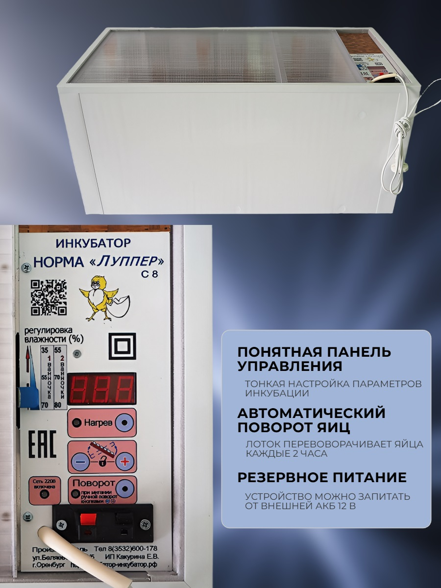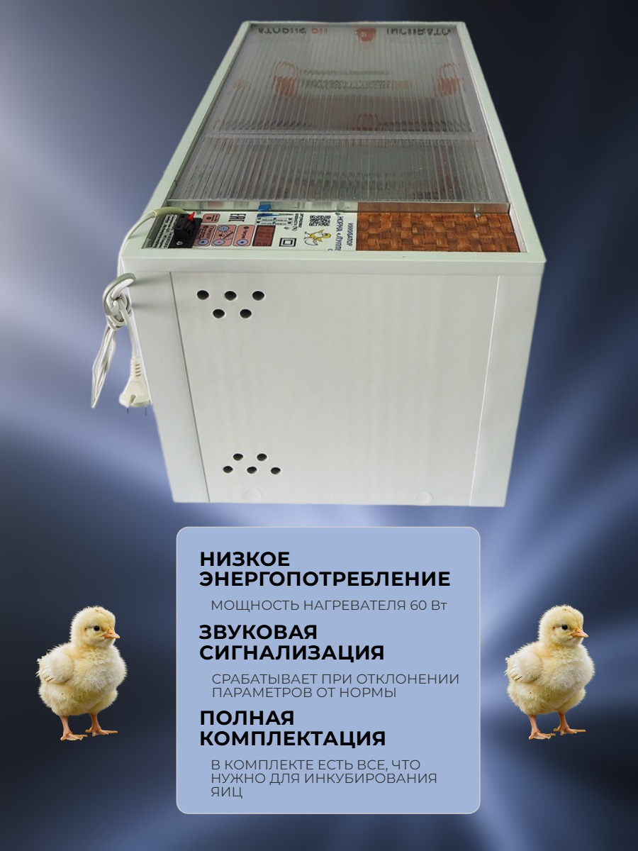Автоматический инкубатор "НОРМА 72" С8 — это недорогая модель от российского производителя, отличающаяся увеличенным объемом (на 72 куриных яйца) и наличием функции автопереворота яиц. Самостоятельно регулирует температуру в заданных пределах и оснащен ванночками для поддержания требуемой влажности. Проконтролировать эти показатели можно с помощью точных термометра и гигрометра. Питается от сети 220 В либо внешнего источника на 12 В.