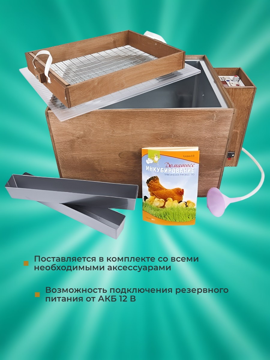 Возможность подключить резервный аккумулятор. К данной модели инкубатора можно подключить внешний источник питания на 12 В. В комплект поставки он не входит. Если у вас есть проблемы с подачей электроэнергии, то рекомендуется приобрести аккумулятор и подключить к нему инкубатор для стабильной работы при отключениях света.