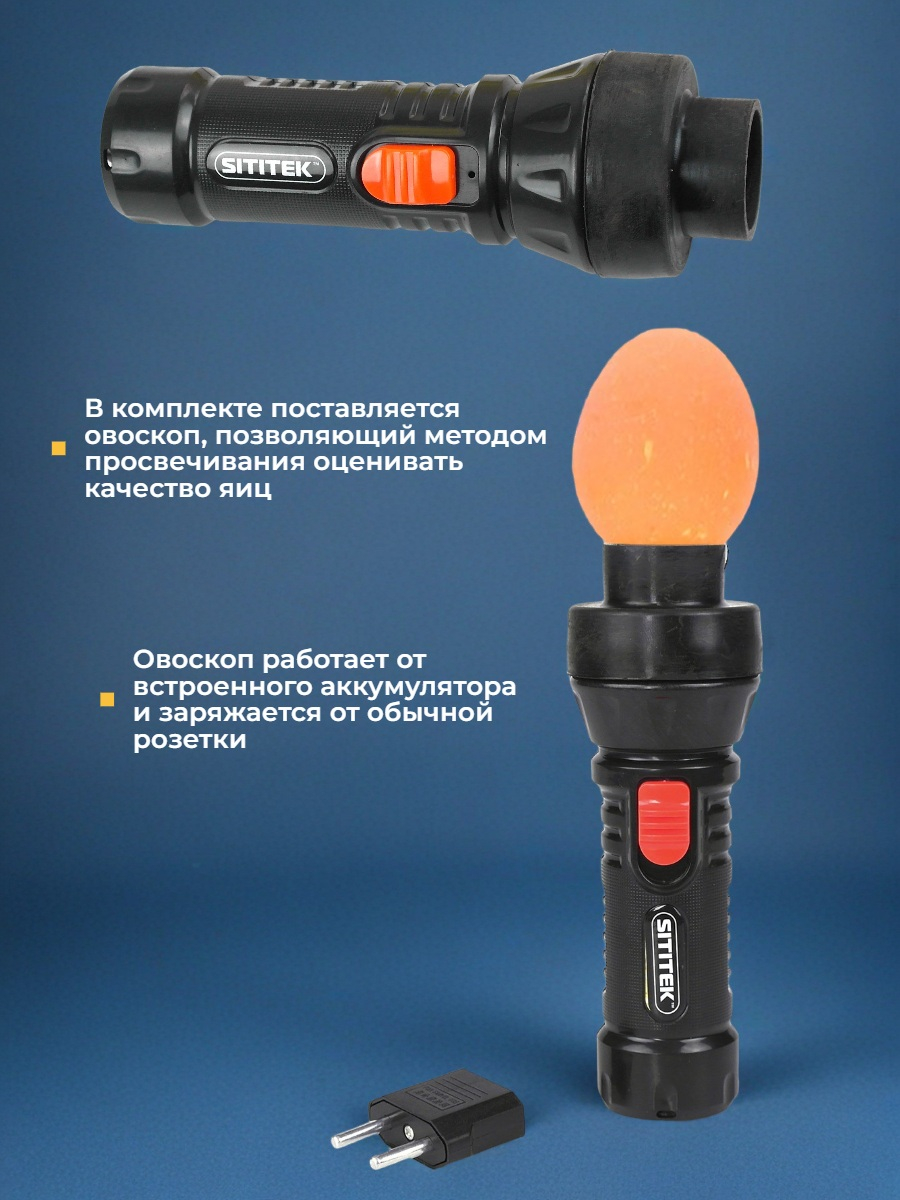 Данный инкубатор поставляется в комплекте с овоскопом — это специальный инструмент, чем-то напоминающий фонарик, позволяющий методом просвечивания определять свежесть конкретного яйца, а также наблюдать за развитием зародыша внутри него.