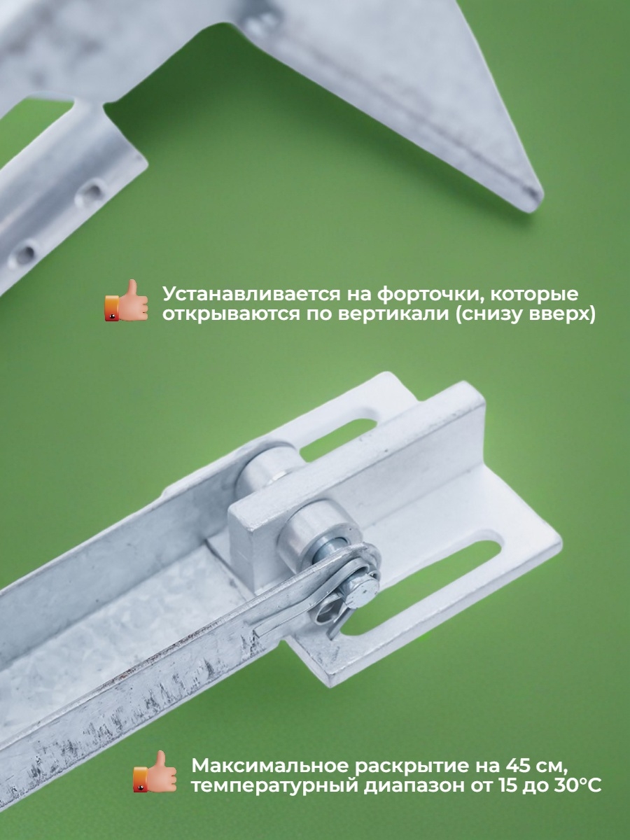 В комплекте идут 4 термопривода "Богатырь-1" с пружинным механизмом для проветривания теплицы в автоматическом режиме. Прочные металлические модели способны поднимать окно весом до 7 кг и надежно удерживать его даже при порывах ветра до 12 м/с. Автоматика для проветривания теплицы работает в широком температурном диапазоне 15-30°C: чем жарче, тем шире открывается окно, и наоборот. Устройства легко устанавливаются и практически не требуют обслуживания.
