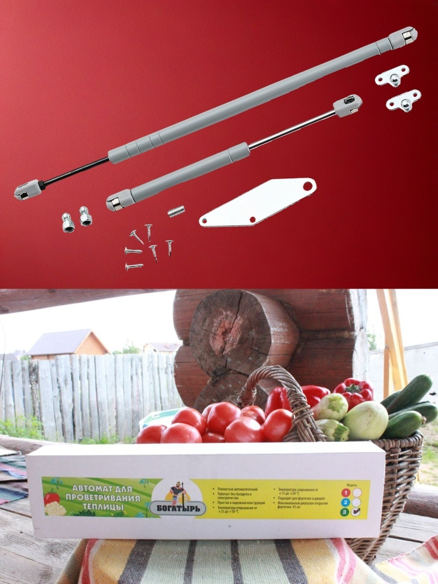 В данный комплект входят сразу четыре термопривода для проветривания теплиц "Богатырь-Д", каждый из которых оснащен доводчиком и имеет универсальную схему установки на окно или дверь. Каждое представленное в комплекте устройство для проветривания теплицы работает в широком температурном диапазоне (от 15 до 30°C), имеет хорошую ветрозащиту при порывах до 12 м/с и действует полностью автоматически.