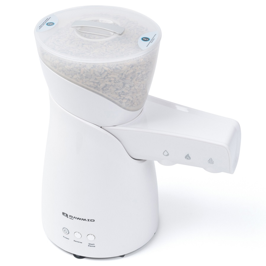 Компактный маслопресс "RAWMID Mini RMO-02" удобен тем, что работает автоматически. Его не нужно настраивать, подбирать программу в зависимости от типа сырья и т.д. Для получения свежего натурального масла необходимо подготовить исходное сырье, т.е. очистить орехи от скорлупы, промыть и просушить их. Рекомендуется предварительно слегка измельчить особо крупные орехи, но не доводить их до состояния муки. Также можно немного обжарить их — это увеличит эффективность отжима. Затем подготовьте маслопресс к работе, установив его на ровную поверхность и поместив под него контейнеры для жмыха и для готового масла. На емкость для масла установите сетчатый фильтр. Засыпьте сырье в бункер маслопресса и закройте его крышкой (объем бункера составляет 700 мл).