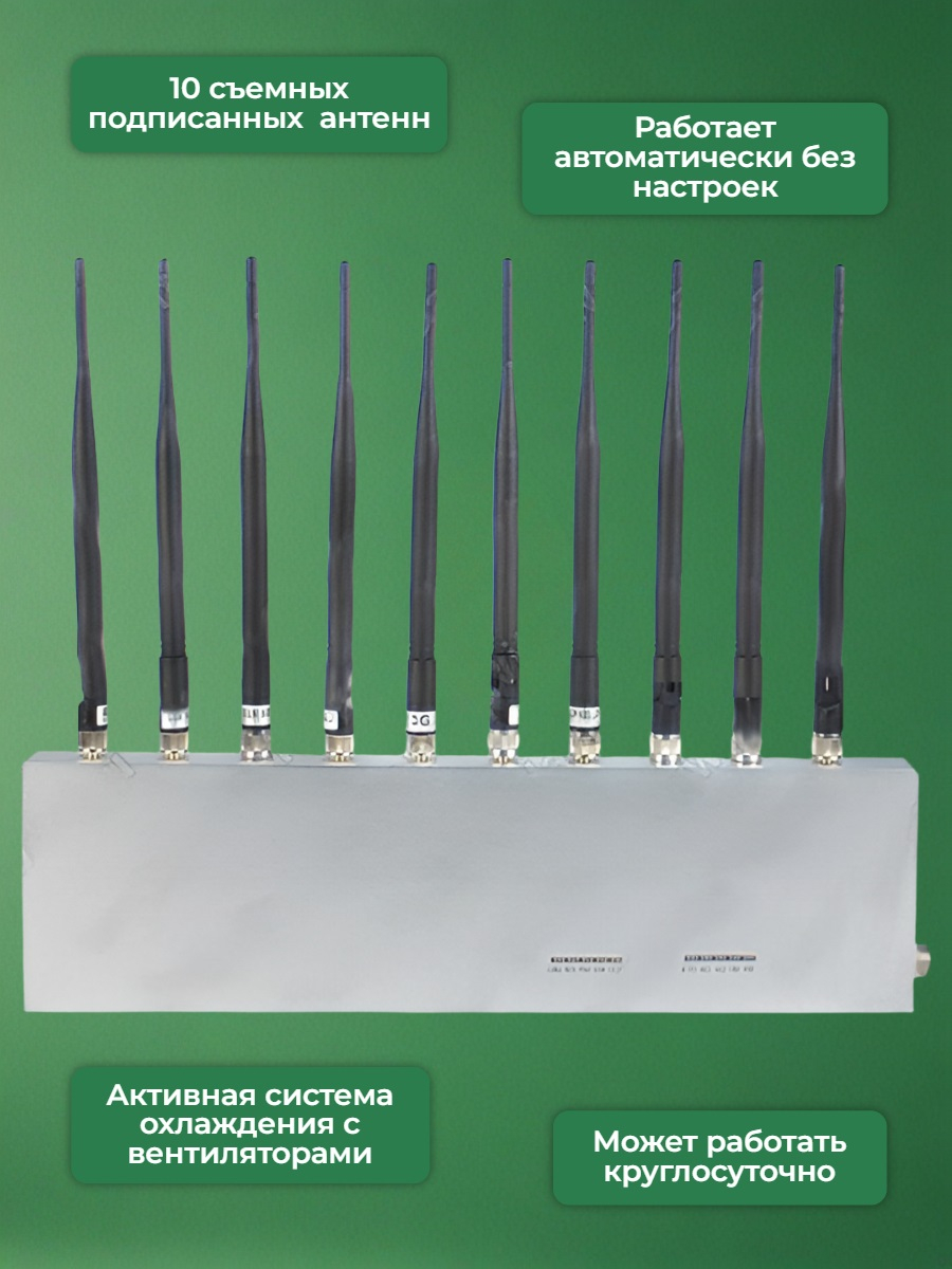 Для начала подавления диапазонов передачи данных достаточно просто подать питание и включить устройство, предварительно установив на корпусе все 10 антенн. Данная модель подавителя не требует никаких специальных настроек и работает полностью автоматически.