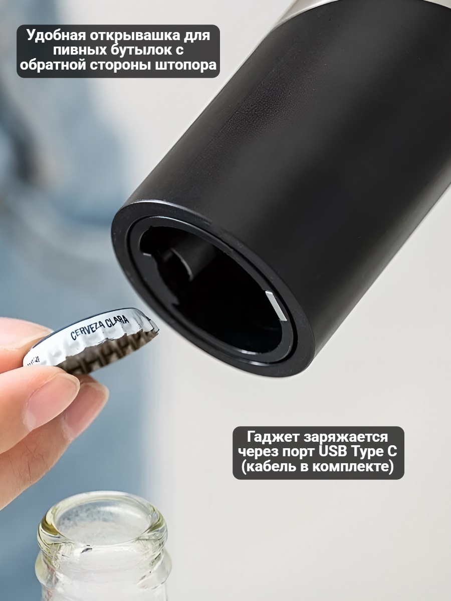 Если повернуть штопор другим концом, то у вас в руках окажется удобная открывашка для пивных бутылок. Совместите ее с крышкой и нажмите на штопор. Вы услышите характерный звук открываемой бутылки пива. При этом крышка никогда не упадет на пол и не потеряется. Дело в том, что открывашка оснащена встроенным магнитом, который прочно фиксирует крышку. Снимите ее с магнита руками и утилизируйте. Таким образом, штопор является универсальным устройством, с помощью которого можно открывать как винные, так и пивные бутылки.