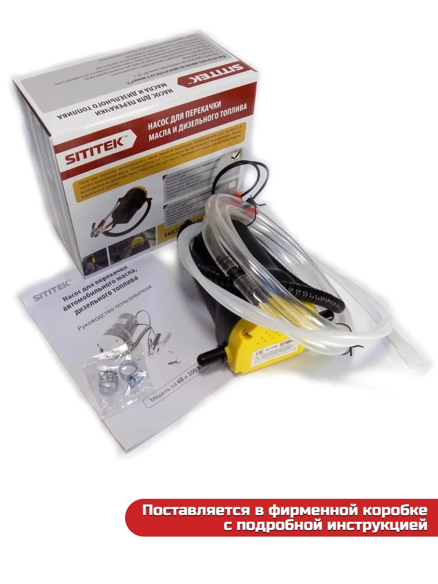 Насос для замены моторного масла через щуп и перекачки дизельного топлива "SITITEK 60Вт" отличается доступной ценой и компактностью, питается от внешнего аккумулятора на 12 В (к примеру, автомобильного). Его мощности в 60 Вт вполне хватает для откачивания масла из двигателя со скоростью до 1 л/мин, поэтому процесс замены не займет много времени. Дизельное топливо прибор способен перекачивать с более высокой скоростью (до 3 л/мин). Комплектуется всем необходимым для начала работы: шлангами, хомутами и проводами питания.