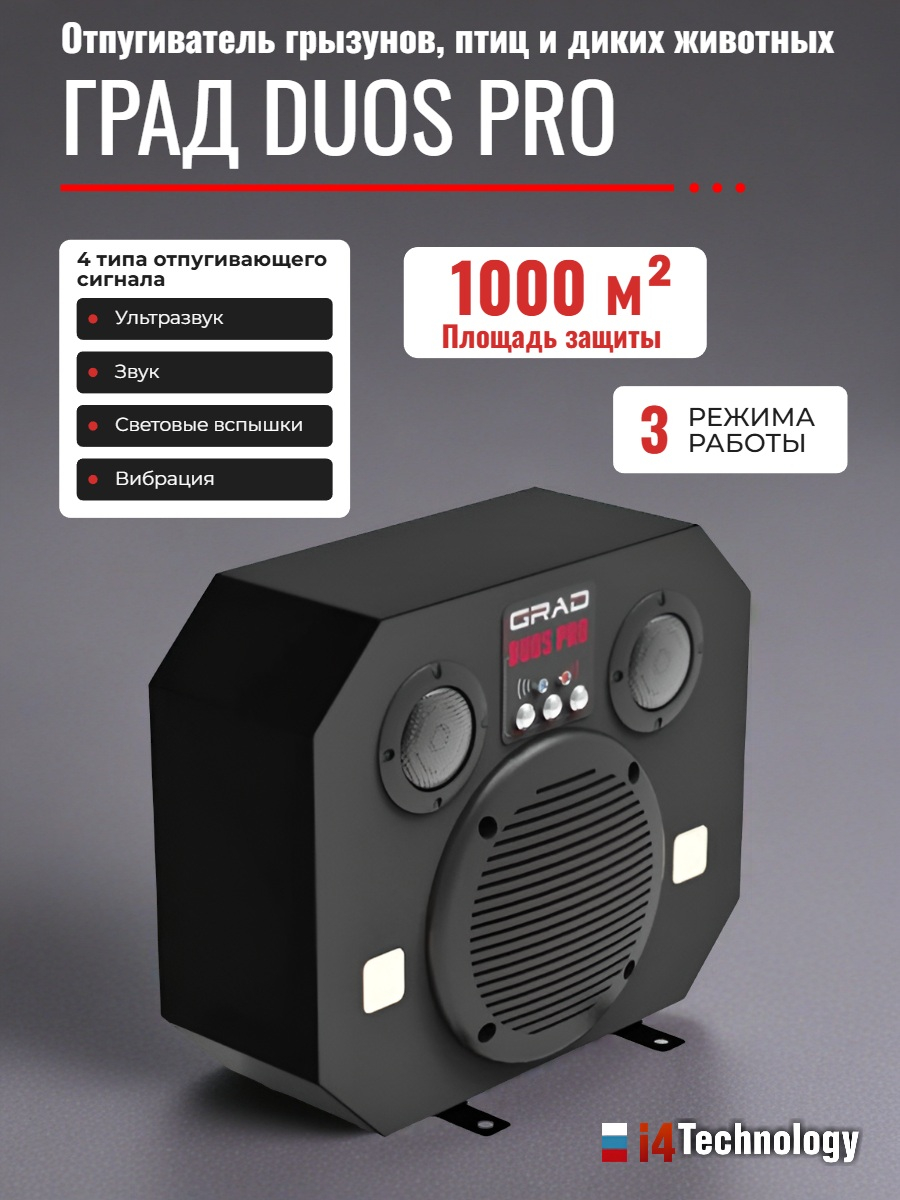 Отпугиватель нового поколения "ГРАД DUOS PRO" производится в России компанией i4Technology (ООО "Айфо-Технолоджи"). Все приборы, производимые на заводах этой компании, проходят многоступенчатую систему контроля качества. Их отличает высокое качество сборки, надежность, долговечность и точное соответствие всем заявленным техническим характеристикам.