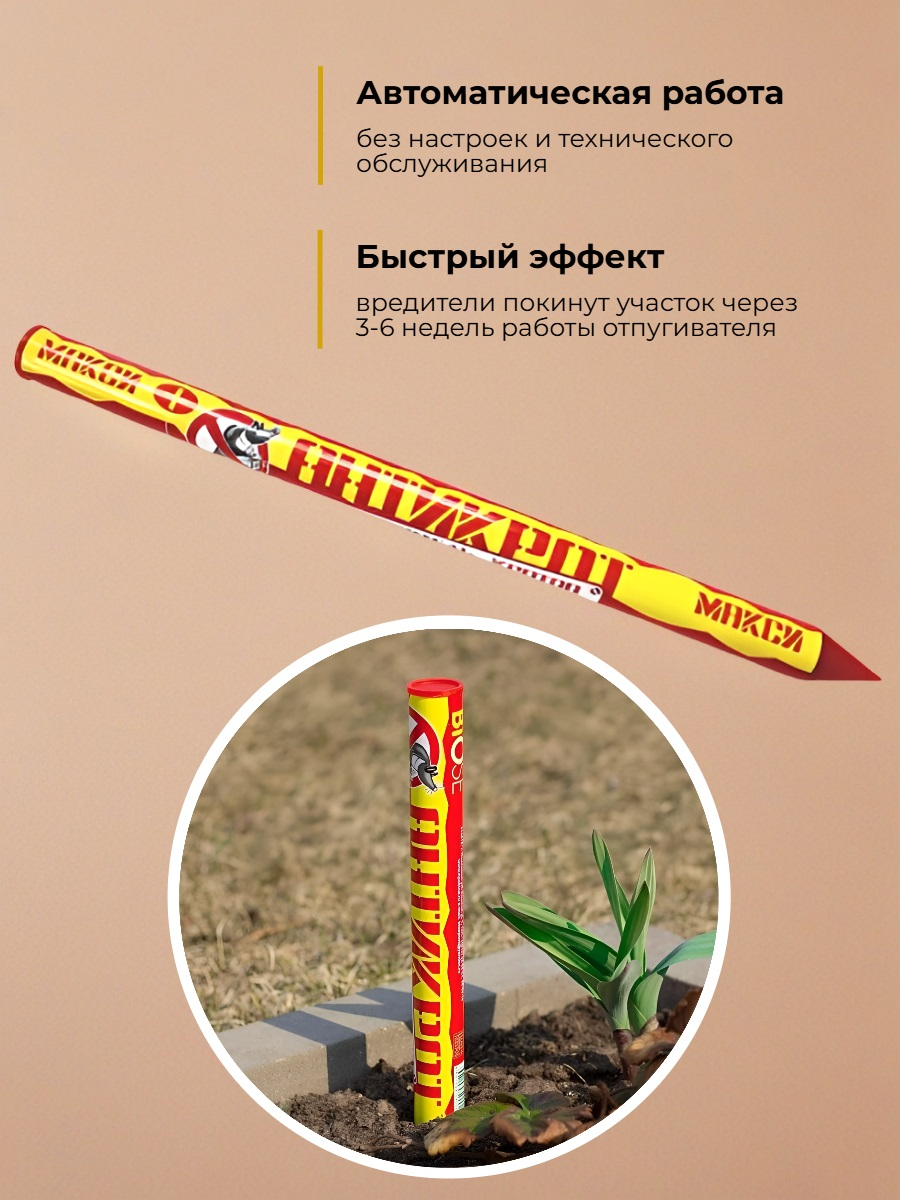 Электронный отпугиватель кротов "АНТИКРОТ Макси+" — самая мощная модель в линейке "АНТИКРОТ", эффективно действующая на земельных участках площадью до 10 соток. Отпугивает кротов, различных грызунов, медведок, землероек и других вредителей периодически излучаемыми УЗ волнами, из-за которых в почве возникают вибрации. Питается от комплекта из 8 батареек типа "R14", рассчитанных на 3 месяца непрерывной работы устройства.
