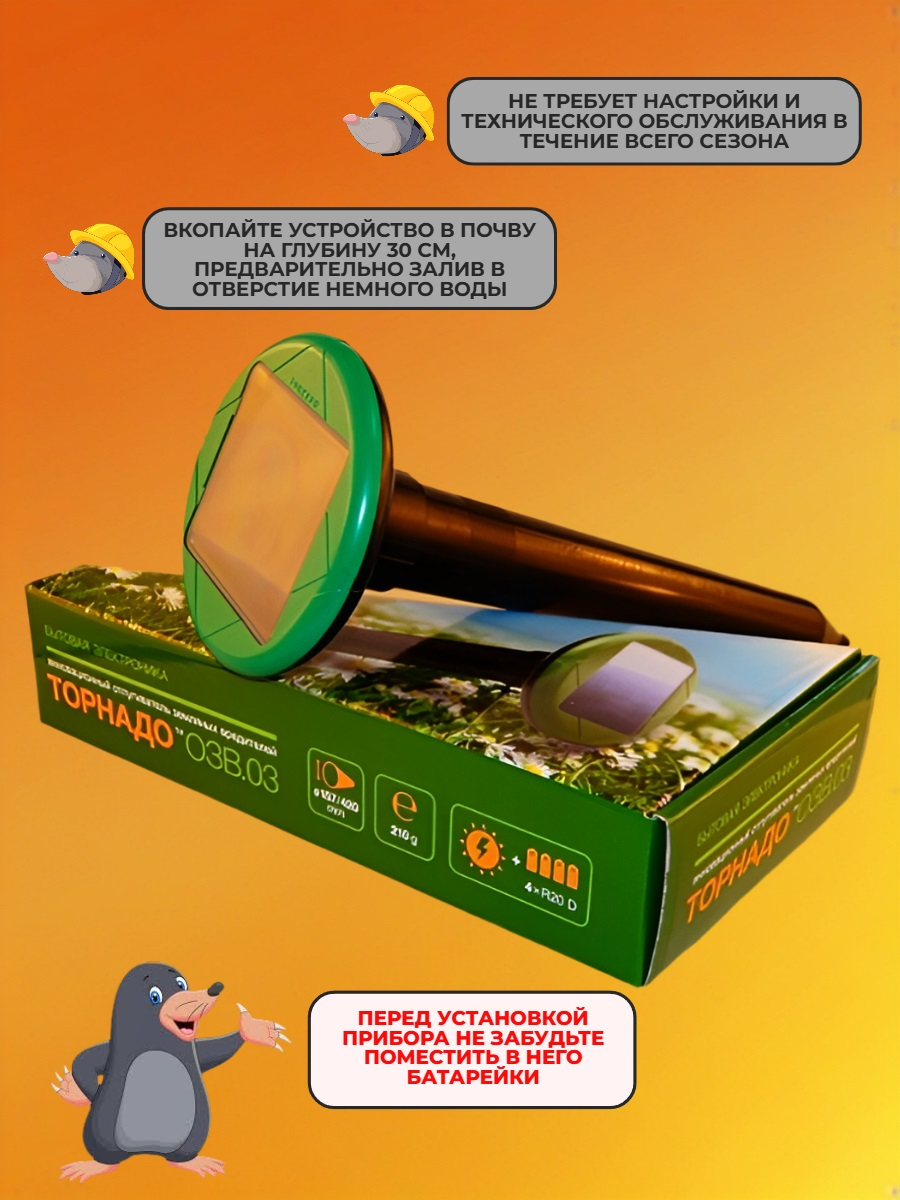 Отпугиватель кротов "Торнадо ОЗВ 03" на солнечных батареях — инновационный прибор, выполненный во влагозащищенном корпусе, имеющем форму гриба. Генерирует звуковые волны, создавая в почве эффект вибрации, перенести который земляные вредители оказываются не в силах и покидают участок. Данная модель отличается большой зоной действия — охватывает площадь до 1000 м2. Работает от батареек типа "D" и от солнечной батареи, которая значительно продлевает время автономной работы.