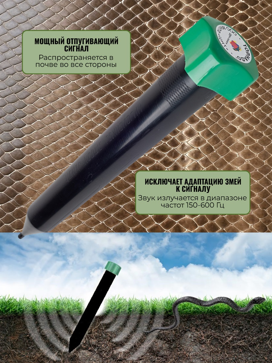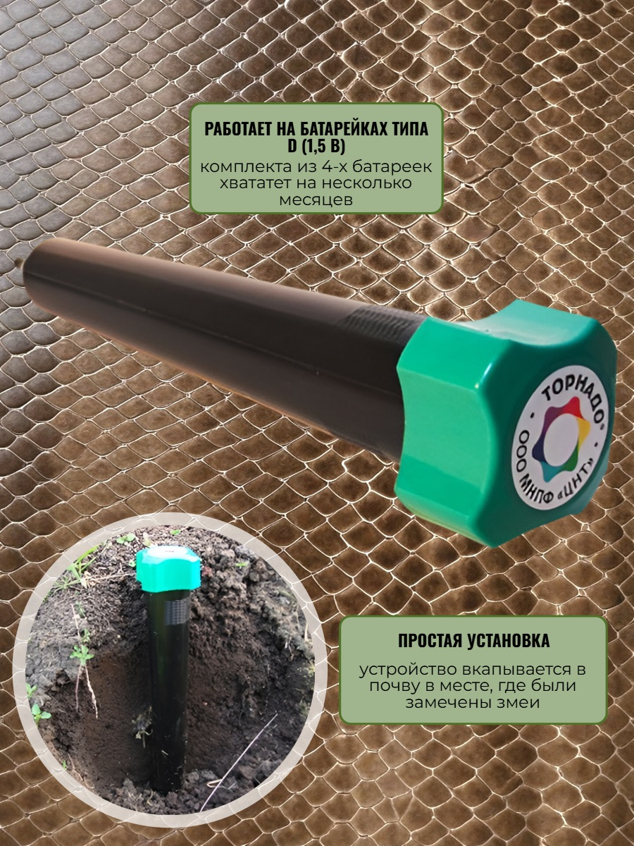 Для многих регионов нашей страны актуальна проблема мешающих змей на приусадебных участках. Это опасные вредители, которые могут нанести серьезную травму человеку, а для домашних питомцев и маленьких детей они вообще смертельно опасны. Змеи любят укромные места, например, заросли кустарника, кучи сена, различные углубления почвы у заборов, они заползают под поленницы или прячутся под крыльцом. Избавиться от змей на участке не так просто. Наш интернет-магазин представляет новую модель отпугивателя змей "Торнадо БОЗ.02", которая поможет зачистить ваш участок от этих вредителей. Устройство выполнено в компактном корпусе и использует проверенный принцип отпугивания змей. Оно создает мощные колебательные движения в почве за счет встроенного мотора, а также дополнительно излучает звуковые волны на низких частотах и генерирует электромагнитное излучение. Данный прибор не уничтожает змей и не причиняет им никакого физического вреда. Отпугивающий сигнал, который излучает прибор, просто делает участок непригодным для проживания змей. Они уползают с него на безопасное расстояние и не вернутся обратно, пока отпугиватель защищает местность. Модель рекомендована для частных домохозяйств, дачных и садовых участков, фермерских полей, ягодников и садов.