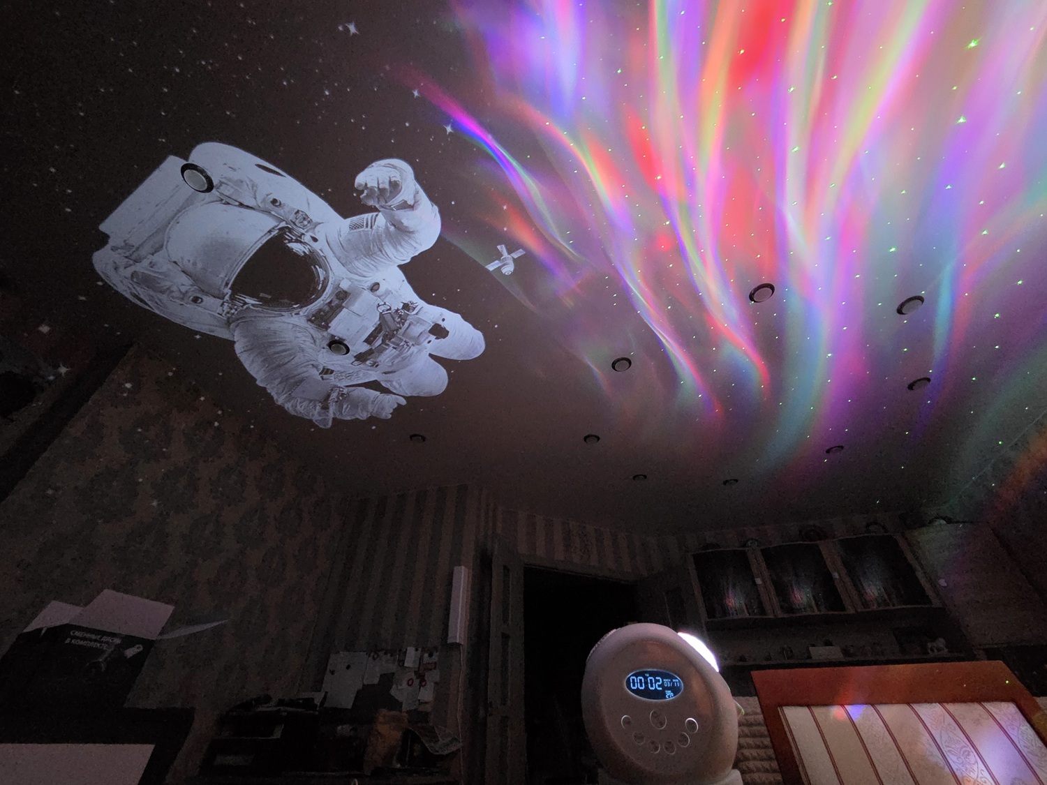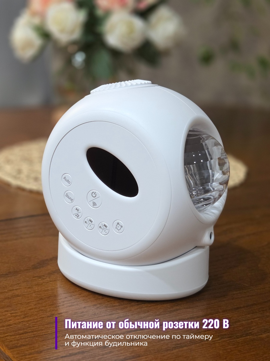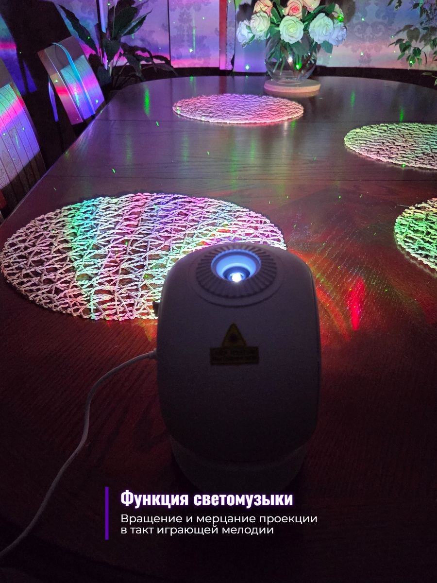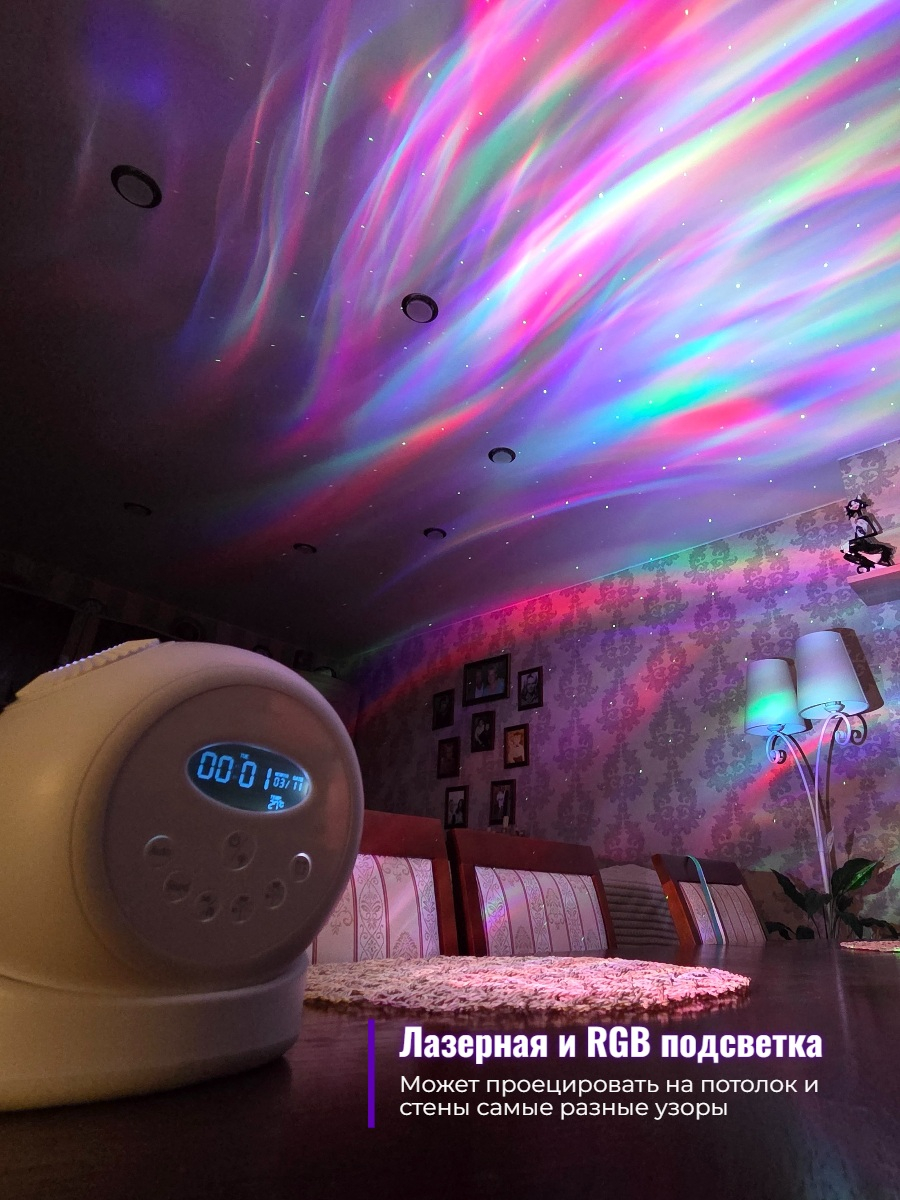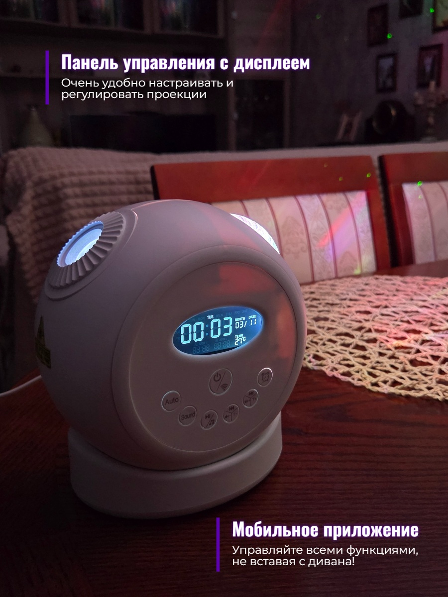 У прибора имеются дополнительные функции. Например, его можно использовать в качестве будильника или ночного светильника. Можно настроить включение проекции по таймеру: проекция автоматически начнет воспроизводиться в указанный день и время.
