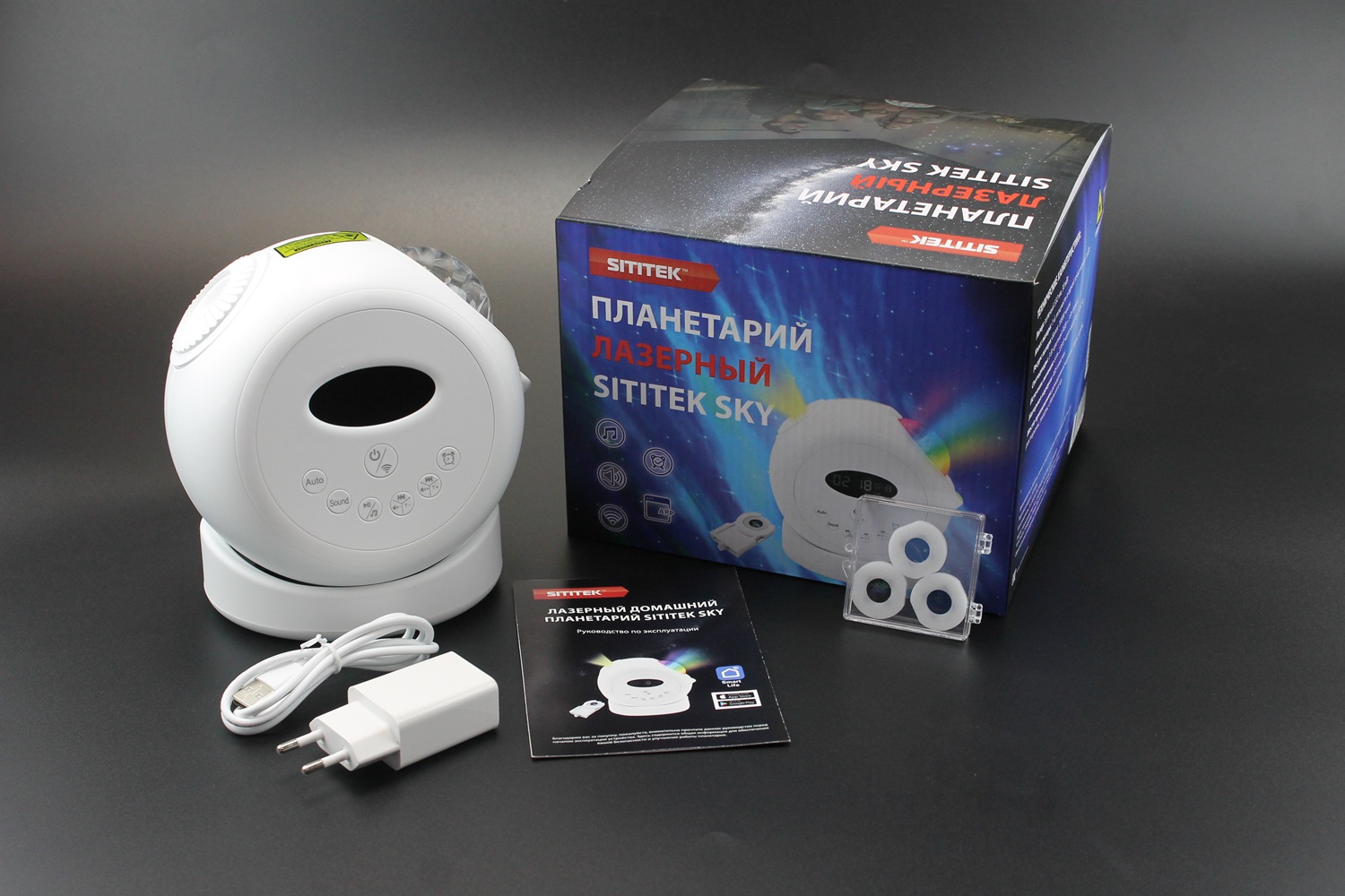 Вид звездного неба нравится и детям, и взрослым. Красивые звезды на темном небе можно рассматривать часами, но для этого придется много времени проводить на улице. Можно ли наслаждаться видом звездного неба, не выходя из комнаты? Конечно! Эксперты нашего интернет-магазина рекомендуют приобрести новую модель планетария "SITITEK Sky" ULTRA HD. Это компактное устройство 2в1 превратит потолок и стены спальни или гостиной в красочное ночное небо с тысячами звезд и созвездий. Планетарий отображает 2 вида проекций: лазерную и светодиодную. Внутри корпуса установлена мощная оптическая линза, а также качественные RGB светодиоды и зеленый лазер. Все это позволяет отображать на поверхности не только черно-белые, но и цветные изображения. Вы сможете насладиться видом Северного сияния и просто раскрасить потолок комнаты в разные цвета! Для вывода оптической проекции устройство комплектуется четырьмя мини-дисками с изображением Луны и Млечного пути, Космонавта, планеты Сатурн и Северного Сияния. Для просмотра проекции достаточно установить диск в лоток на корпусе планетария и включить его. Кроме того, прибор может работать, как ночной светильник, выполнять функцию будильника и воспроизводить проекцию по таймеру.