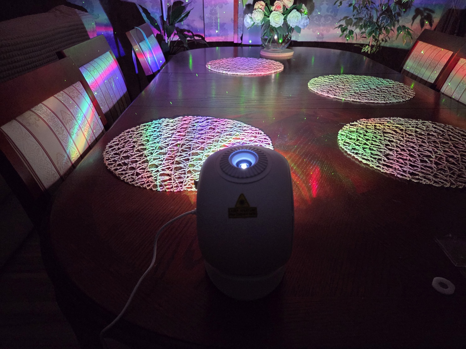 Проектор работает от сети 220 В, кабель питания входит в комплект поставки. Установите его на ровную поверхность и подключите к питанию. Для воспроизведения оптической проекции установите в выдвижной лоток проектора один из мини-дисков с изображением (Луна, Космонавт, Северное сияние или Сатурн). Включите проектор кнопкой на панели управления. Изображение будет отображаться на стенах и потолке комнаты. Оно состоит из 2-х частей. Со стороны оптического модуля воспроизводится проекция с диска, а с другой стороны корпуса устройства выводится лазерная проекция в виде белых или цветных звезд, а также яркого фона разных цветов.
