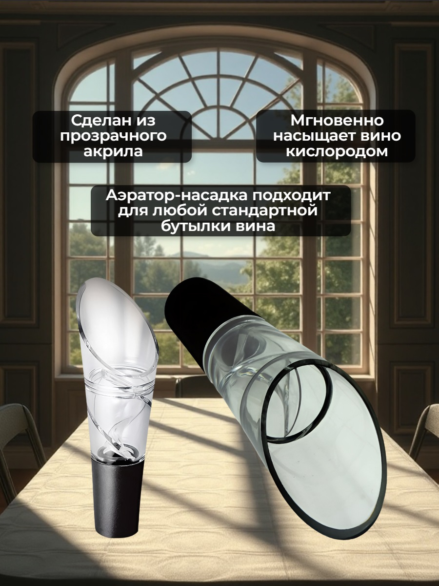 Аэратор позволяет не ждать минимум 20-30 минут, чтобы вино "подышало" в бокале естественным образом. При этом форма в виде насадки очень удобна — аэратор просто фиксируется в горлышке бутылки и не занимает дополнительное место на столе. Кроме того, специальная форма в виде мини-воронки позволяет аккуратно разливать вино по бокалам тонкой струйкой без брызг.