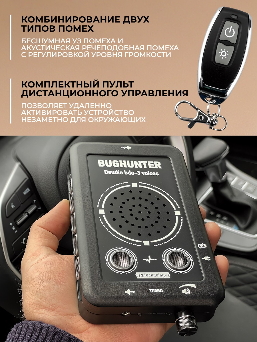 Новая комплектация 2020 г! Подавитель микрофонов и диктофонов "BugHunter DAudio bda-3 Voices" имеет в комплекте пульт с радиусом действия 10 м. С его помощью вы сможете включать и выключать помеху в любом помещении, не вставая с собственного кресла. Это очень удобно и позволяет скрыть свои действия по глушению микрофонов от посторонних (при условии использования только ультразвуковой помехи).