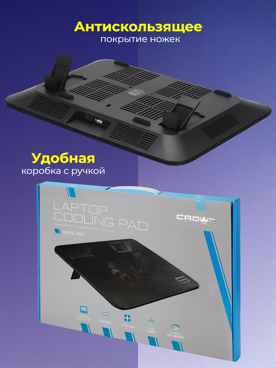 Подставка для ноутбука с системой охлаждения "CROWN CMLS-400" является бюджетным устройством, которое предназначено для комфортной работы с ноутбуком и его защиты от перегрева. С помощью данного изделия вы сможете расположиться со своим ноутбуком там, где вам будет максимально удобно: за столом, на кровати, сидя в кресле, в салоне автомобиля, в поезде и т.д. Кроме того, встроенный вентилятор обеспечивает эффективный отвод горячего воздуха от корпуса ноутбука и не дает ему перегреться. Такая защита продлевает срок эксплуатации ноутбука, защищает его комплектующие, увеличивает производительность и снижает риск "зависания" системы в результате перегрева. С такой подставкой вам будет удобно работать за ноутбуком, расположив его на коленях или просто на полу. Это прекрасное дополнение как к рабочему, так и к игровому ноутбуку!