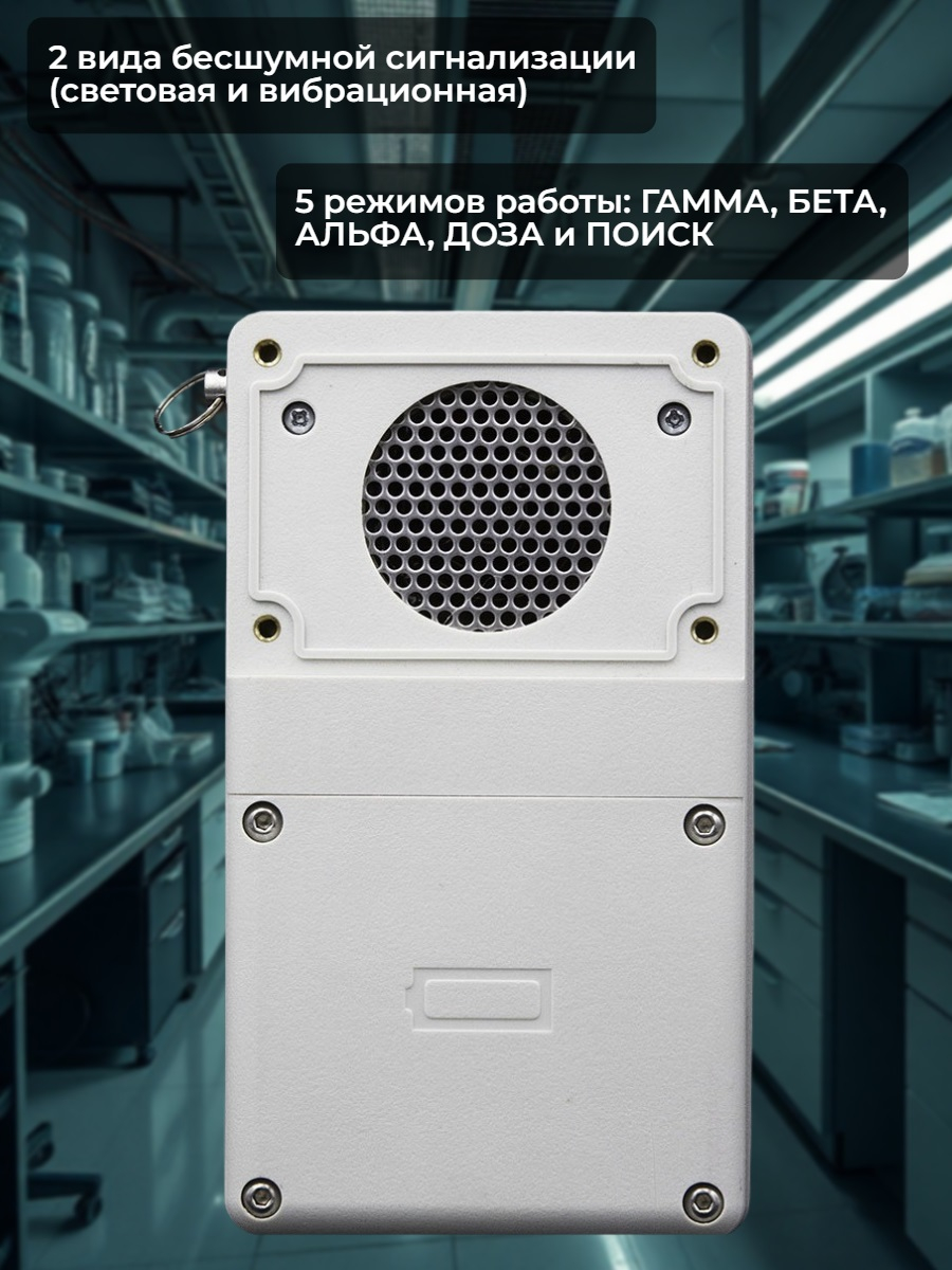 2 вида бесшумной сигнализации (свет и вибрация) — помимо звуковой тревожной сигнализации, прибор может оповещать об опасном уровне радиации бесшумно, используя свет и вибрацию корпуса. Это удобно в тех случаях, когда нужно измерить уровень радиации незаметно, а также при работе в помещениях, где нужно соблюдать тишину. При обнаружении радиации выше установленного порогового значения прибор будет подавать мигающий световой сигнал, а его корпус начнет вибрировать.