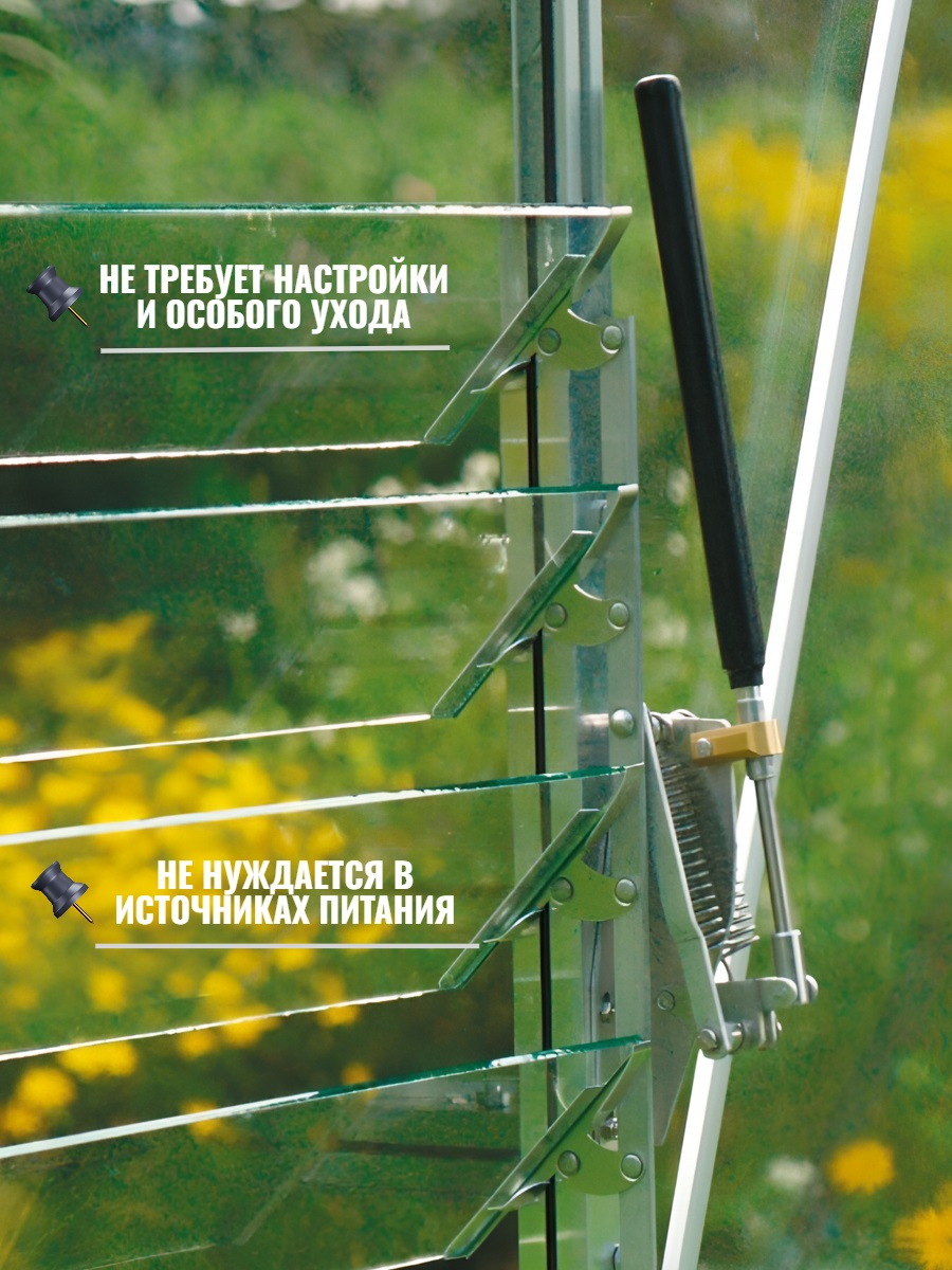 Термопривод-"открывашка" для проветривания теплицы "SESAM LIBERTY" органично встраивается в любую систему открывания окна типа жалюзи. Основной элемент конструкции — гидравлический цилиндр со специальной термочувствительной жидкостью внутри. При нагревании (когда в теплице становится слишком жарко) она выталкивает подсоединенный шток, который начинает открывать окно. При похолодании происходит обратный процесс. По умолчанию система настроена так, что начинает открывать окно, как только температура внутри теплицы поднимается выше +17°C, однако вы можете отрегулировать температуру начала открывания окна в теплице вручную! Для этого просто вращайте цилиндр в механизме по или против часовой стрелки — каждый оборот повышает или понижает порог срабатывания на 0,5°C. Максимально можно установить температуру начала срабатывания механизма на отметке +25°C (подойдет для очень теплолюбивых растений). Максимальное раскрытие окна происходит при +30°C.