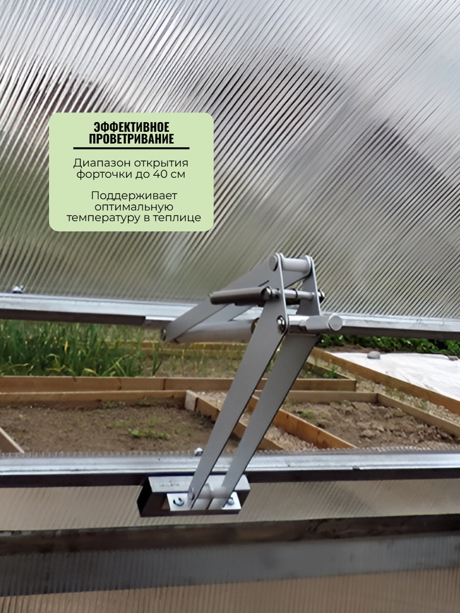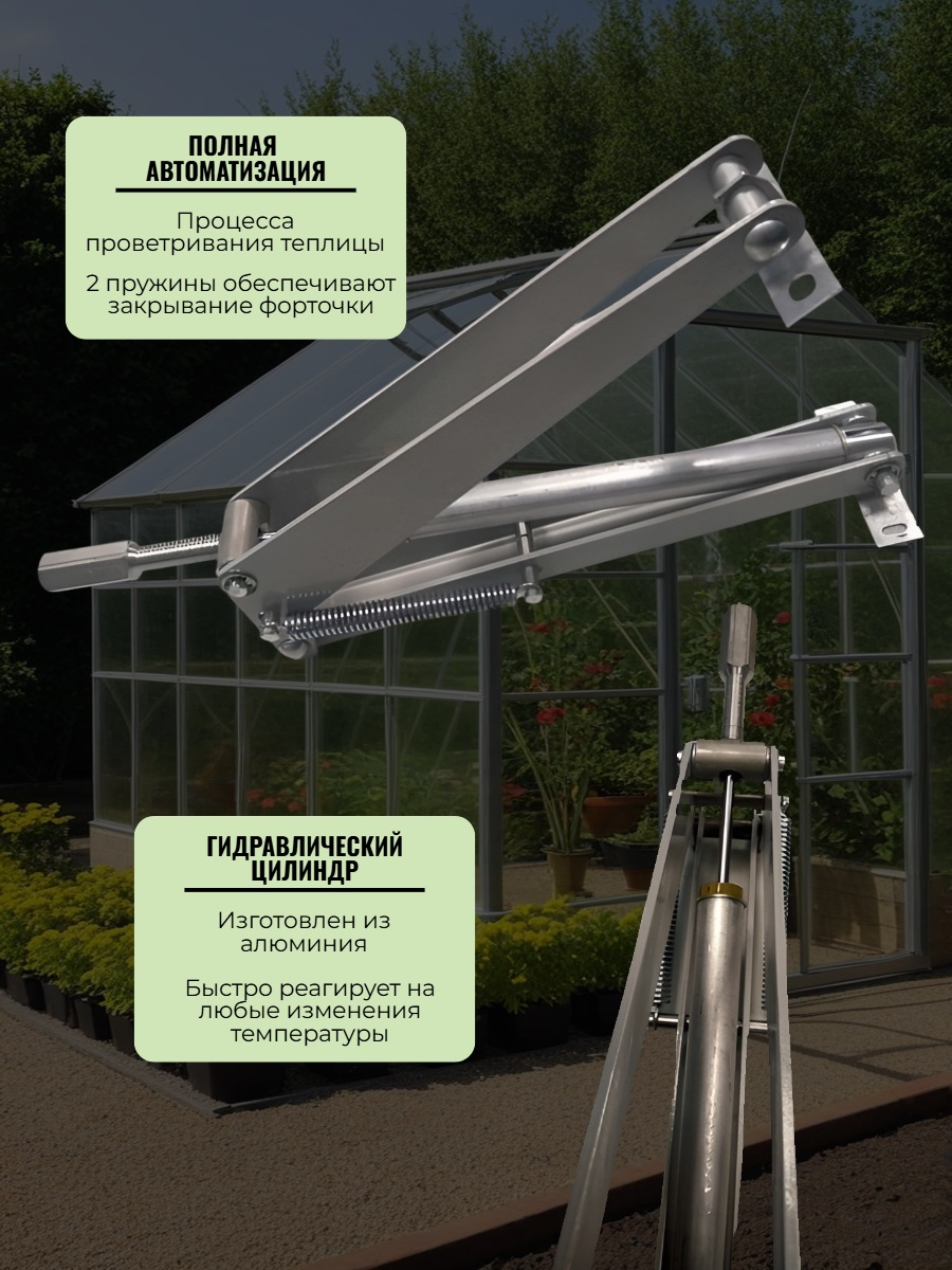 "Botanik" — автомат для проветривания теплиц, отличающийся повышенной прочностью и надежностью. Благодаря усиленной конструкции (стальные плечи 3 мм, две мощные пружины), устройство не только без проблем открывает/закрывает форточки весом до 15 кг, но и удерживает створки под сильными порывами ветра. Возможность регулировки температуры открывания (в пределах +20...+25 °С) позволяет использовать термопривод "Botanik" для выращивания определенных культур.