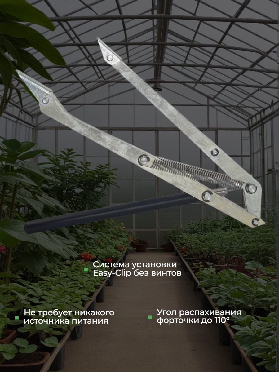 Автоматический проветриватель "Vordich" следует устанавливать в теплице весной и демонтировать осенью. Не рекомендуется оставлять его внутри теплицы на зиму, поскольку резкие перепады температур и сильные замораживания могут нарушить работу термоцилиндра. Данная модель предназначена для установки на тепличные форточки с вертикальным распахиванием, для установки на горизонтальные форточки и двери вы можете найти другие термоприводы в нашем магазине. Обязательно плотно зафиксируйте зажимы системы Easy-Clip на раме форточки и проверьте надежность фиксации перед использованием термопривода. Не превышайте максимально допустимую нагрузку в 14 кг.