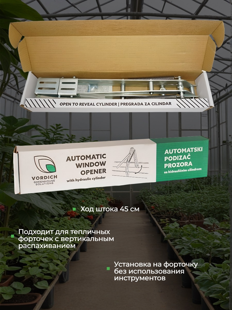 Обеспечить стабильное проветривание теплицы, в которой высажены растения, крайне важно — это подтвердит любой опытный дачник. Без регулярного проветривания растения в теплице на летней жаре могут банально "задохнуться", а если дверь или форточку в теплице держать постоянно открытой — растения ночью могут замерзнуть. Что делать? Особенно если нет возможности жить летом на даче и каждый день вручную открывать/закрывать форточку в теплице? Используйте термопривод "Vordich"! Это специальное полностью автономное устройство для автоматического проветривания теплицы. Оно устанавливается на форточку и работает, реагируя на температуру окружающей среды: когда внутри теплицы становится жарко — плавно распахивает створку форточки, а когда прохладно — закрывает ее. И все это без прямого участия человека! При этом модель "Vordich" отличается еще и очень удобной системой установки, позволяющей смонтировать термопривод в теплице своими силами буквально за минуту без специальных инструментов.