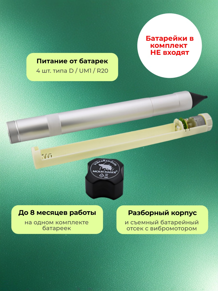 Форма, в которой выполнен прибор, позволяет легко и просто устанавливать его в почву. Встроенный генератор через излучатель посылает сигналы определенной частоты, которые дополняются вибрацией от вибромотора и заставляют кротов в панике покидать "насиженные" места в радиусе действия прибора. Безусловно, вредители не покидают территорию сию секунду, это может занять до нескольких недель при постоянном применении отпугивателя.