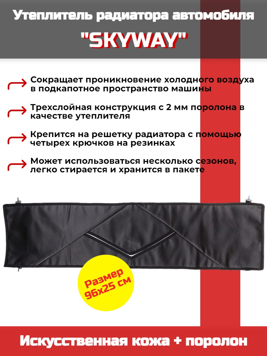 Утеплитель радиатора машины "SKYWAY для ВАЗ 2101 и Нива" используется с целью сохранения температурного режима двигателя автомобиля при эксплуатации в холодное время года. Технически его нужно просто установить на решетку радиатора и зафиксировать (универсальная система креплений в виде резинок и крючков позволяет надежно зафиксировать утеплитель, идеально повторяя контуры решетки радиатора). Наличие на решетке радиатора утеплителя значительно сокращает проникновение потока холодного воздуха в подкапотное пространство автомобиля, тем самым ускоряет процесс нагрева двигателя и позволяет поддерживать рабочую температуру во время движения в зимний период.
